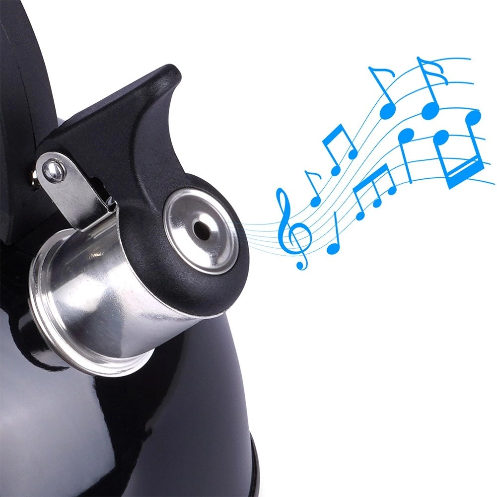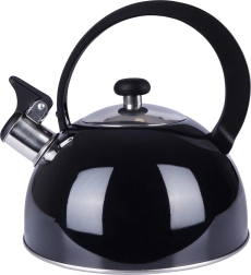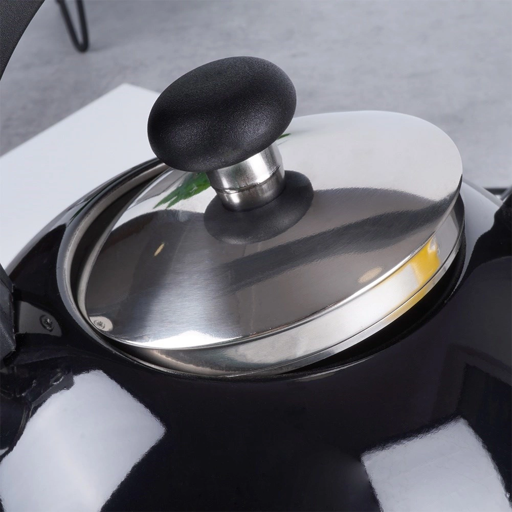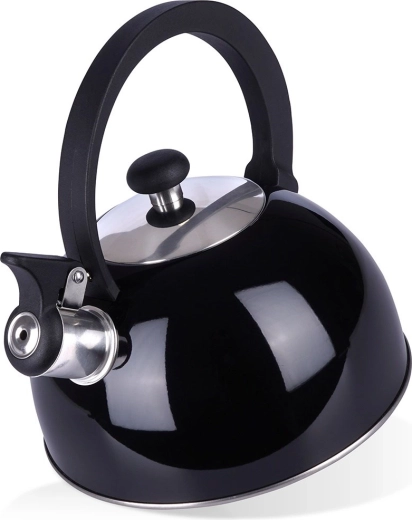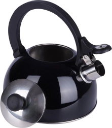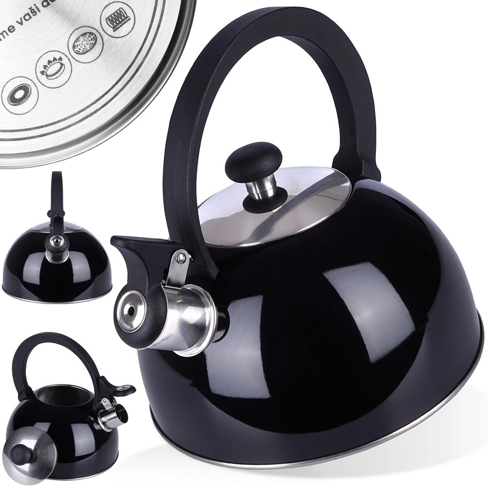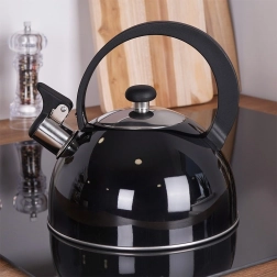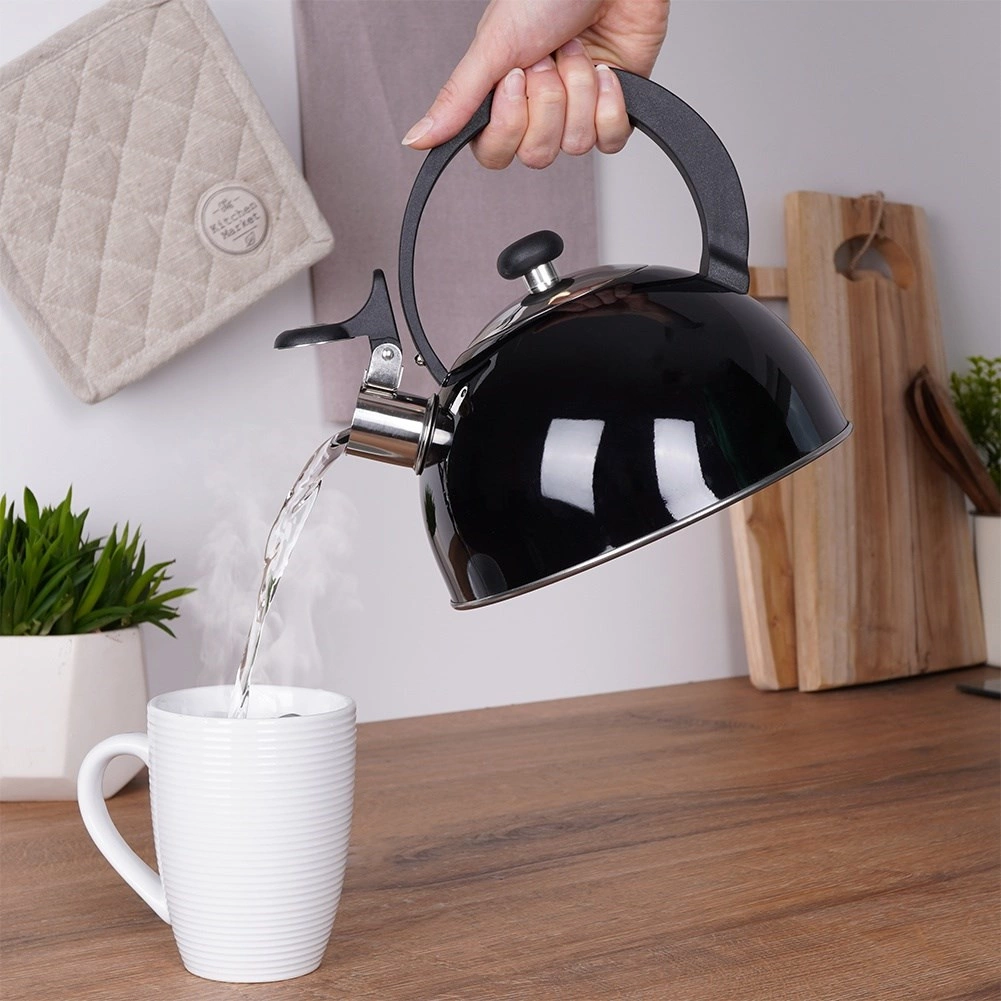 Elegante zwarte fluitketel van hoogwaardige roestvrij staal voor snel en veilig water koken. Uitstekend dankzij een modern design, universele compatibiliteit inclusief inductie en een comfortabele ergonomische handgreep. Het bruikbare volume van 1,5 l is ideaal voor de dagelijkse bereiding van thee en koffie.