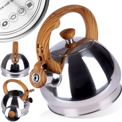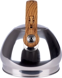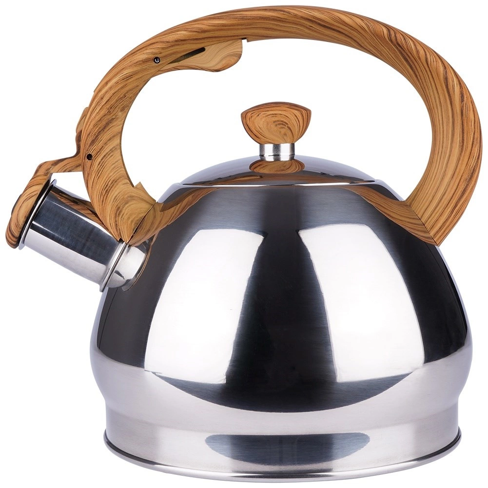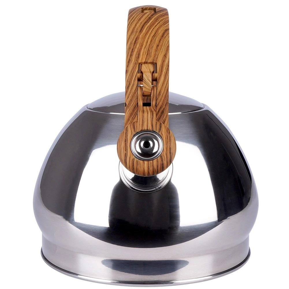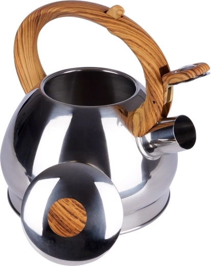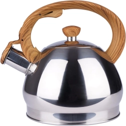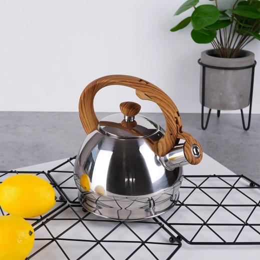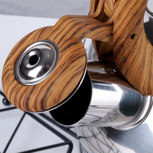 Stijlvolle roestvrijstalen fluitketel met een inhoud van 1,5 l en een automatisch fluitdeksel voor een veilige kookmelding. Ergonomisch hittebestendig handvat met houtlook voor comfortabel schenken, brede bodem voor snel opwarmen en universele compatibiliteit inclusief inductie. Ideaal voor thee, koffie en kruiden.