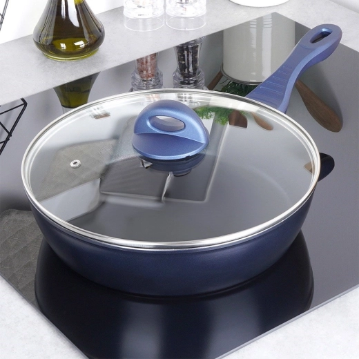 Deze robuuste pan van gegoten aluminium met een diamantversterkte antiaanbaklaag blinkt uit in uitstekende warmtegeleiding en duurzaamheid, zelfs bij frequent gebruik. Dankzij de hoge rand is hij ideaal om te bakken, roerbakken en stoven, terwijl het glazen deksel met stoomventiel je koken onder controle houdt.