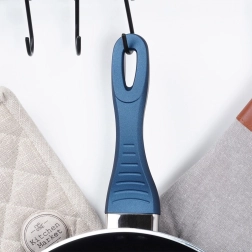 De geprofileerde handgreep met zacht siliconen oppervlak wordt niet heet; de stevige klinknagels zorgen voor stabiliteit en een zekere grip tijdens roeren en serveren.