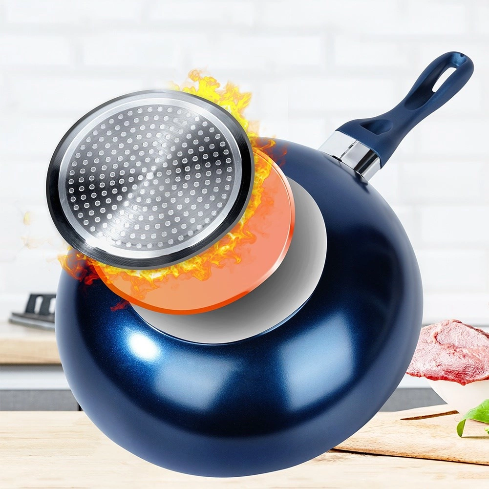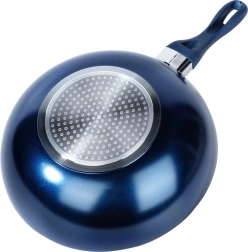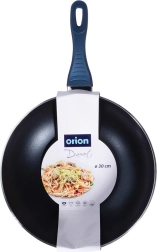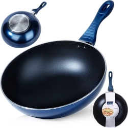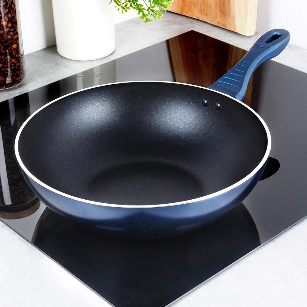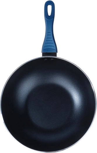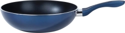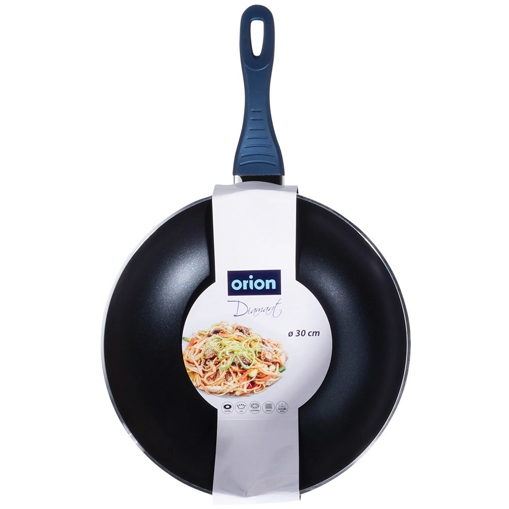 Universele wokpan met een diameter van 30 cm met een zeer duurzame diamanten antiaanbaklaag voor snel en gelijkmatig koken. Robuuste aluminium body, inductiebodem en ergonomische, koelblijvende handgreep in het blauw. Geschikt voor alle soorten kookplaten, ideaal voor vetarm bakken en roerbakken, eenvoudig te reinigen en vaatwasserbestendig.