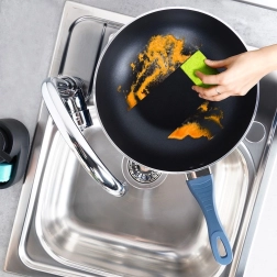 De duurzame keramische matrix met diamantdeeltjes geleidt warmte uitstekend en bevat geen PFOA of PTFE. De pan is compatibel met gas, elektrisch, keramisch, halogeen en inductie. De ergonomische handgreep met antislip-siliconen blijft koel en ligt prettig in de hand; de blauwe buitenkant geeft elke keuken een frisse look.