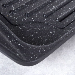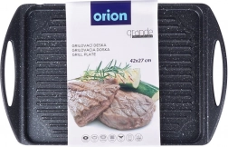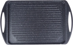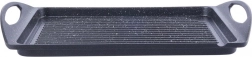 Praktische grillplaat van 42 × 27 cm met een robuuste aluminium behuizing en PFLUON GRANIT granieten antiaanbaklaag voor een gelijkmatige warmteverdeling. Het geribbelde oppervlak zorgt voor de typische grillstrepen en voert vet af, geïntegreerde handgrepen maken het hanteren gemakkelijk. Geschikt voor gas-, elektrische, keramische en inductiekookplaten, voor in de oven en op de tuingrill. Vrij van PFOA en PTFE, eenvoudig te reinigen en geschikt voor de vaatwasser.