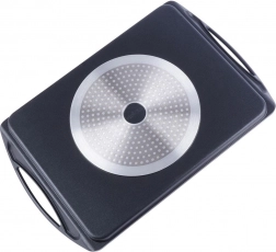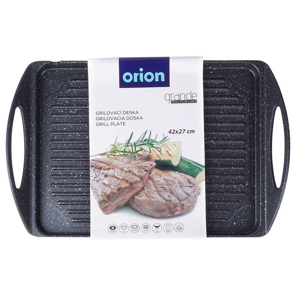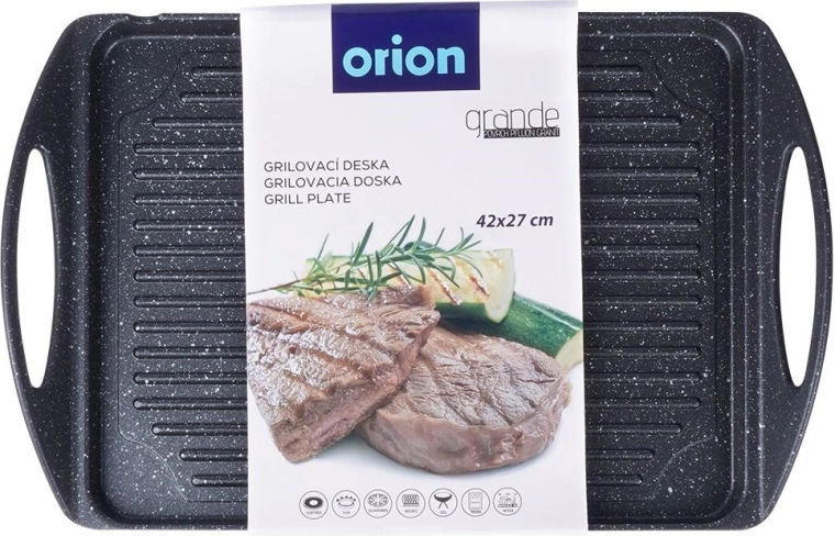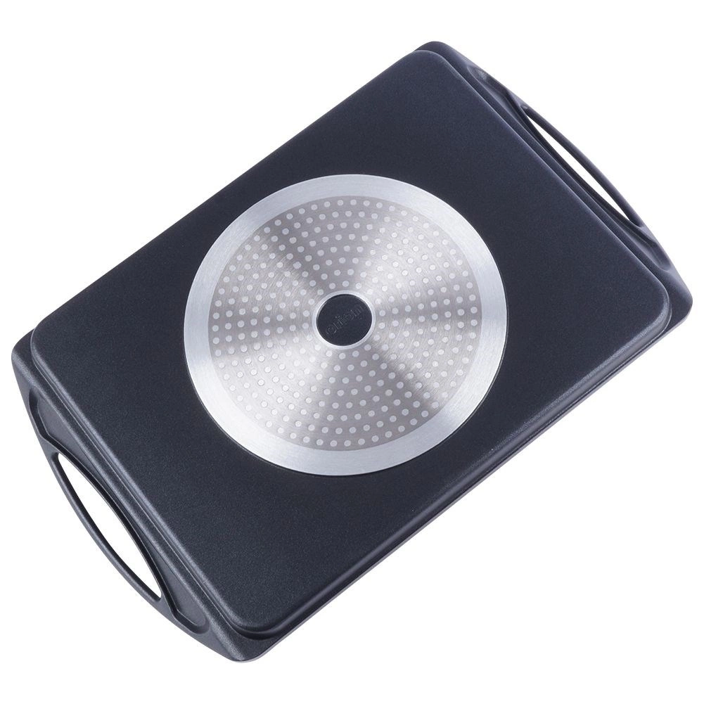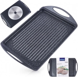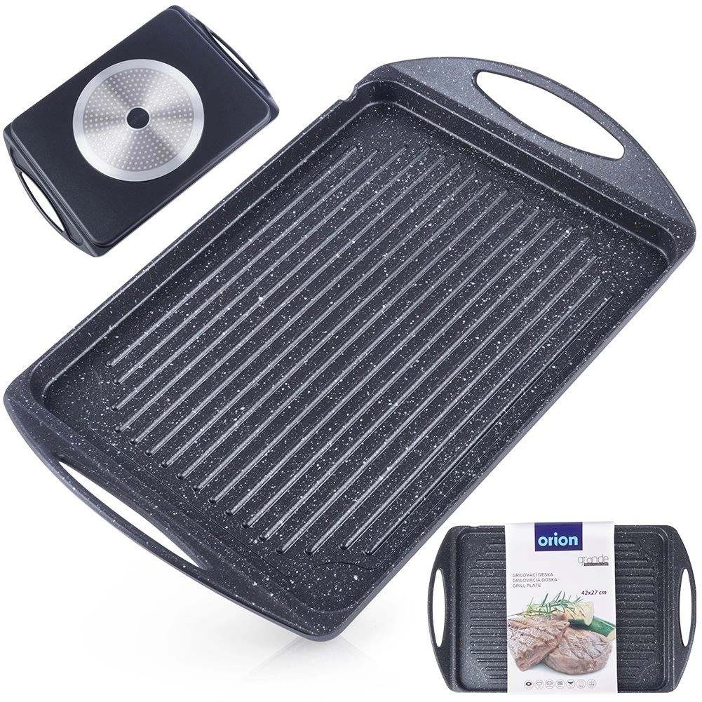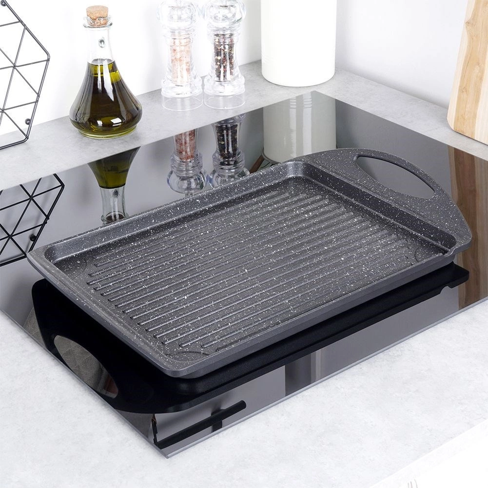 De plaat is compatibel met de meeste warmtebronnen, inclusief inductie, en kan ook in de oven of op de grill worden gebruikt. Geïntegreerde zijhandgrepen garanderen veilig verplaatsen. De binnenafmeting van 34 × 26 × 2 cm biedt voldoende ruimte voor vlees, groenten, vis en kaas.