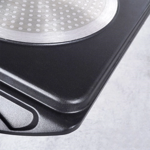 De duurzame PFLUON GRANIT toplaag vermindert aanbakken, vereenvoudigt het reinigen en maakt koken met minder vet mogelijk.
