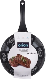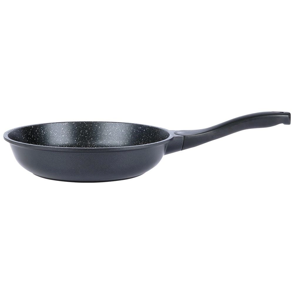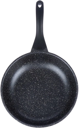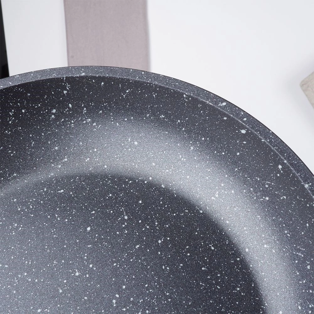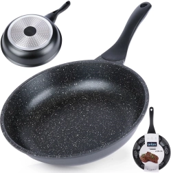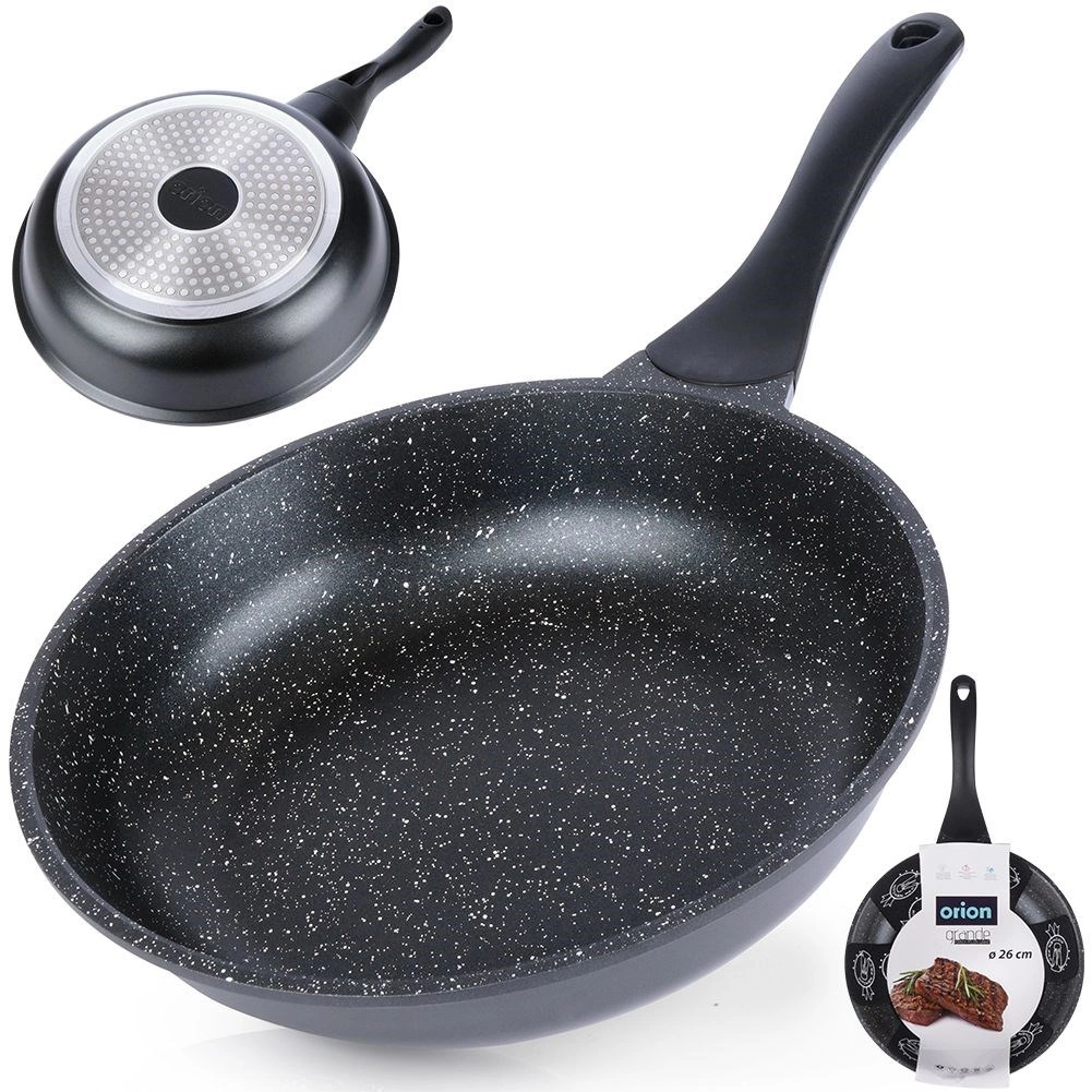 Duurzame granieten pan 26 cm voor bakken en stoven met een antiaanbaklaag zonder PFOA en PTFE, gelijkmatige warmteverdeling en inductiecompatibiliteit. Heeft een massieve aluminium behuizing, een comfortabel koelblijvend handvat en is vaatwasmachinebestendig.