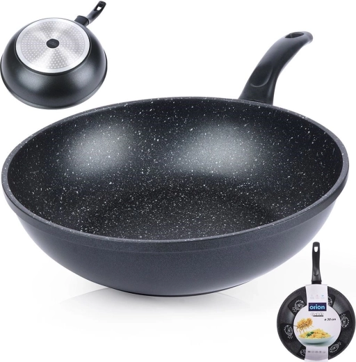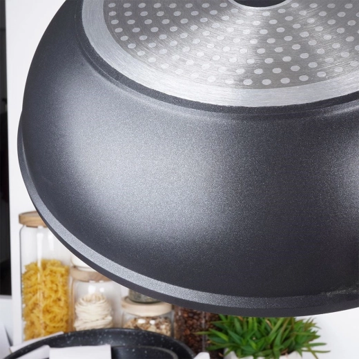 Universele granieten wok met een diameter van 30 cm van duurzaam gegoten aluminium voor snel en gelijkmatig koken. Dankzij de anti-aanbak granieten coating zonder PFOA en PTFE bereidt u gezonde en smakelijke gerechten met een minimum aan vet. Geschikt voor gas, elektrisch, keramisch, halogeen en inductie en vaatwasserbestendig.