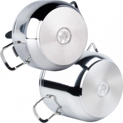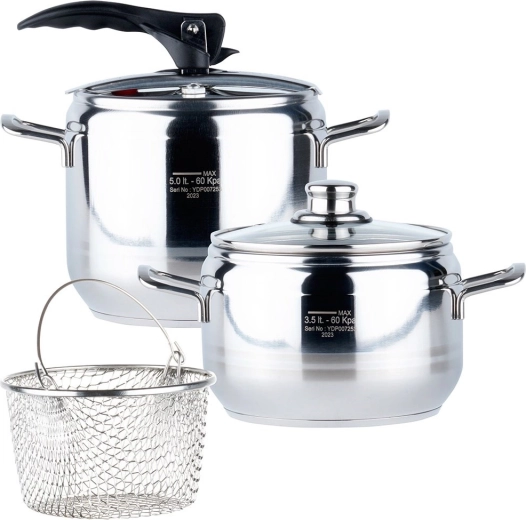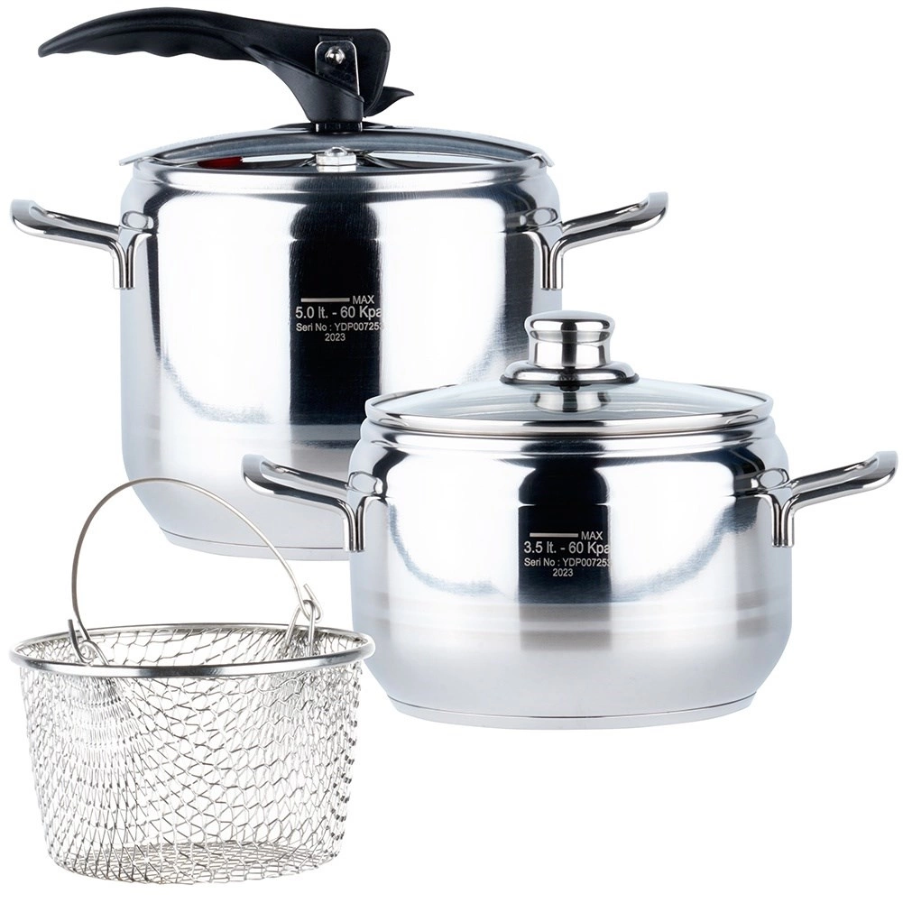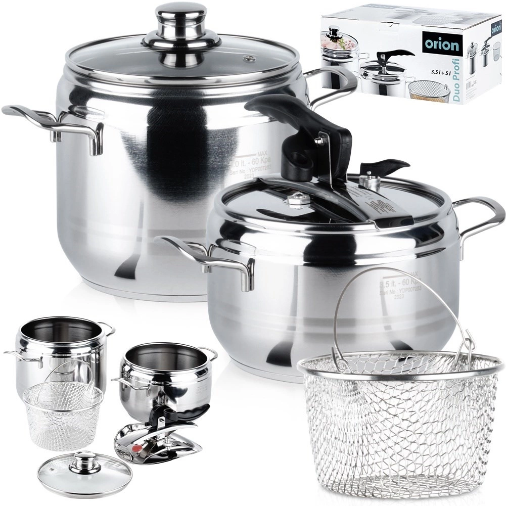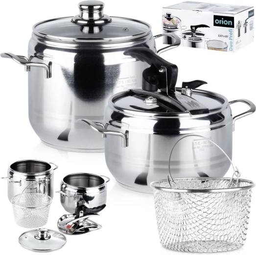 Praktische set van twee roestvrijstalen snelkookpannen met een inhoud van 3,5 en 5 l, geschikt voor alle soorten kookplaten, inclusief inductie. De set bevat een snelkookdeksel, een glazen deksel en een metalen mand voor koken, afgieten of frituren. De dikke 3-laagse bodem zorgt voor een gelijkmatige warmteverdeling, terwijl 2 veiligheidsventielen en drukregeling zorgen voor zorgeloos koken. Dankzij koken onder druk is de pan snel en energiezuinig en zonder deksel eenvoudig te reinigen in de vaatwasser.