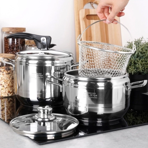 De PROFI-set snelkookpannen van hoogwaardig roestvrij staal verkort de bereidingstijd tot een minimum en behoudt meer smaak en voedingsstoffen. Twee volumes (3,5 en 5 l) dekken het dagelijks koken – van soepen en sauzen tot peulvruchten en vlees. Met het glazen deksel verandert de pan in een gewone kookpan, terwijl de mand het stomen, afgieten en frituren vergemakkelijkt.