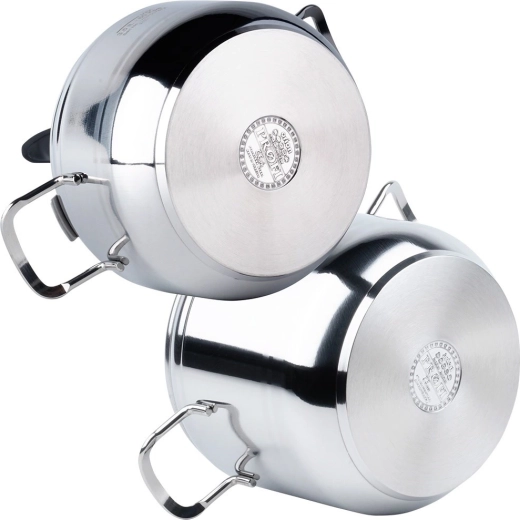 De veiligheid wordt gewaarborgd door twee veiligheidsventielen, de mogelijkheid tot drukregeling en een duurzaam sluitsysteem dat de afdichting ontziet. De 3-laagse sandwichbodem verdeelt de warmte gelijkmatig en is compatibel met gas, elektrisch, keramisch, halogeen en inductie. De pannen zijn zonder deksels vaatwasmachinebestendig.