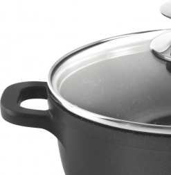 Het transparante glazen deksel met roestvrijstalen rand en stoomventiel maakt controle tijdens het koken mogelijk zonder onnodig optillen. Dankzij de inductiebodem verspreidt de warmte zich snel en gelijkmatig, waardoor u tijd en energie bespaart. De pan is vaatwasmachinebestendig en kan in de oven worden gebruikt (deksel tot 200 °C).