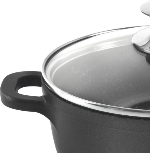 Praktische granieten pan met een diameter van 24 cm en een inhoud van 4 l, met een duurzaam glazen deksel voor dagelijks koken. Het aluminium body met een anti-aanbak granieten PFLUON-coating zorgt voor een snelle en gelijkmatige opwarming, eenvoudig reinigen en koken met een minimum aan vet. Vrij van PFOA en PTFE, geschikt voor alle soorten kookplaten inclusief inductie en voor gebruik in de oven (deksel tot 200 °C).