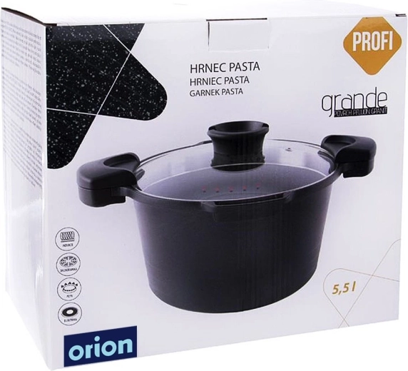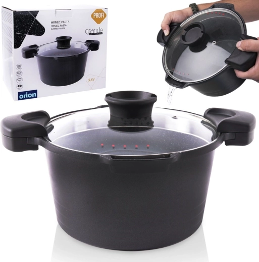 Universele granieten pan ORION GRANDE met een inhoud van 5,5 l en een diameter van 24 cm, voorzien van een praktisch afgietdeksel voor eenvoudig afgieten van water. Dankzij de antiaanbak granieten coating zonder PFOA en PTFE, snelle en gelijkmatige verhitting en inductiebodem is hij ideaal voor dagelijks koken, stoven en het bereiden van pasta en aardappelen. Ergonomische handgrepen zorgen voor een veilige grip en het glazen deksel maakt kookcontrole mogelijk.
