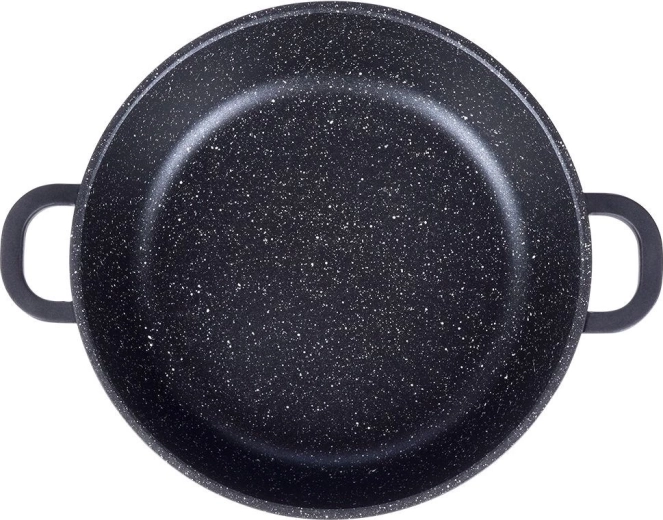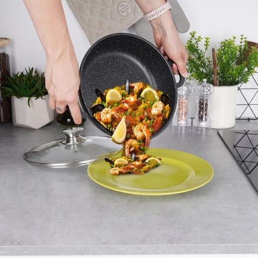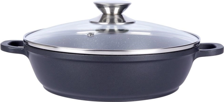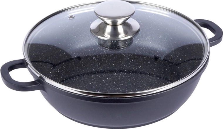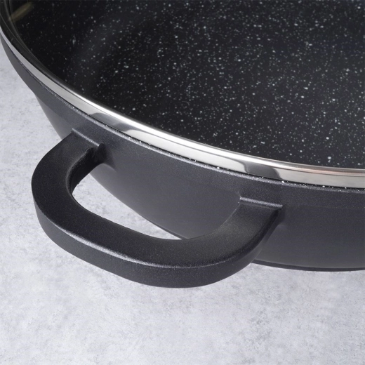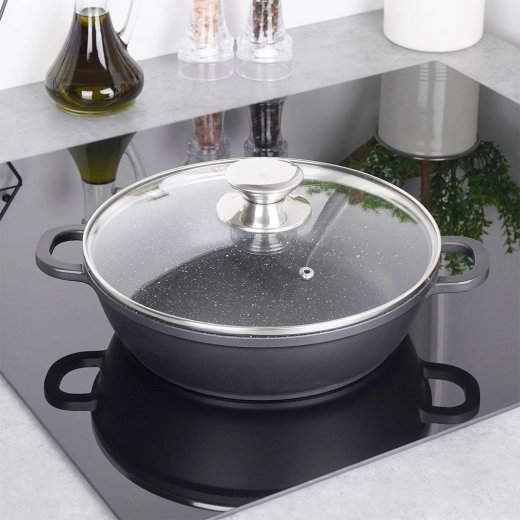 Deze duurzame granieten pan is ideaal voor bakken, roerbakken en stoven. Het stevige aluminium lichaam in combinatie met de PFLUON-granietlaag garandeert uitstekende antiaanbak-eigenschappen, eenvoudig schoonmaken en koken met minimaal vet. Het glazen deksel met roestvrijstalen rand en stoomventiel helpt warmte en sappigheid te behouden.