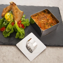 Deze vierkante vorm van hoogwaardig roestvrij staal met praktische aandrukker laat je gerechten stijlvol serveren zoals in een restaurant. Je maakt er eenvoudig nette lagen en porties mee – van desserts en salades tot bijgerechten, aardappelen of rijst. De gladde wanden zorgen voor schoon lossen zonder gescheurde randen.