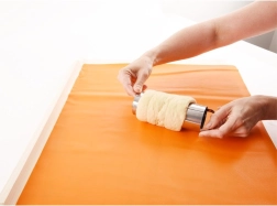 De antiaanbak-siliconenmat biedt een stabiel oppervlak om het deeg uit te rollen en te vormen voordat je het om de vorm wikkelt.