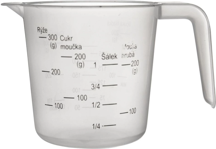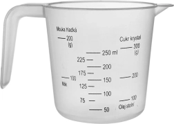 Praktische keukenmaatbeker in de vorm van een mok met handvat en schenktuit voor eenvoudig schenken. Gemaakt van duurzaam en veilig voor de gezondheid transparant plastic, licht van gewicht, makkelijk te reinigen en maakt nauwkeurig meten mogelijk van zowel vloeistoffen als droge ingrediënten tot 250 ml/300 g.