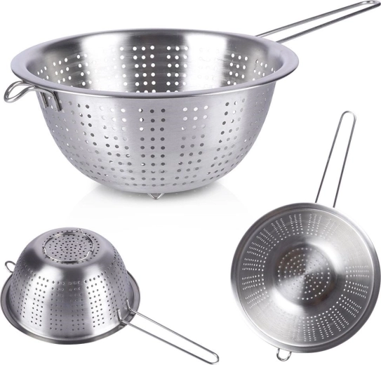 Universeel roestvrijstalen vergiet met een diameter van 21 cm en een lange handgreep, ideaal voor het afschenken van pasta, het wassen van fruit en groenten en het uitgieten van vloeistoffen. Dankzij de stabiele voetjes en de hulphaak kun je het gemakkelijk tegen een pan of kom laten steunen. Gemaakt van hoogwaardige roestvrijstalen voor een lange levensduur en eenvoudig schoonmaken.
