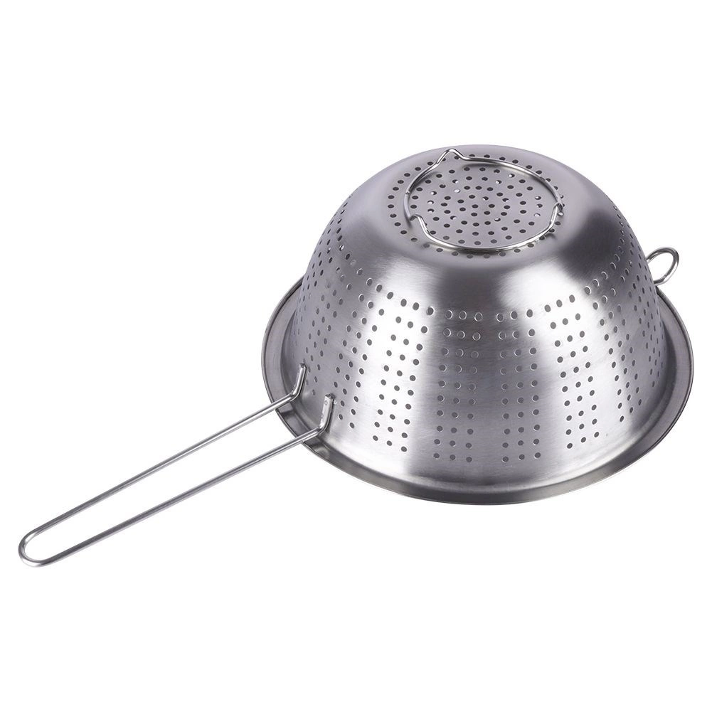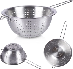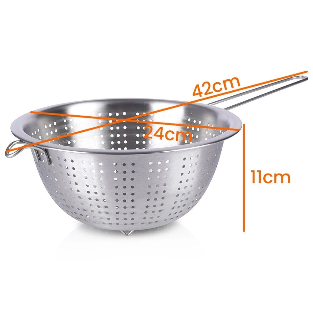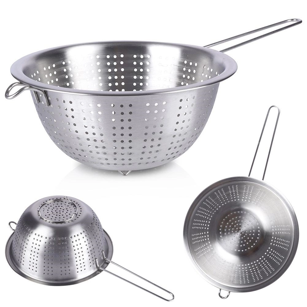 Praktisch roestvrijstalen vergiet met een diameter van 24 cm, een lange handgreep en stabiele pootjes – ideaal voor dagelijks keukenwerk. Perfect voor het afgieten van pasta, het afspoelen van fruit en groenten en rijst. Dankzij het hoogwaardige roestvrij staal is het duurzaam, makkelijk schoon te maken en heeft het een comfortabele grip plus de mogelijkheid om op te hangen.