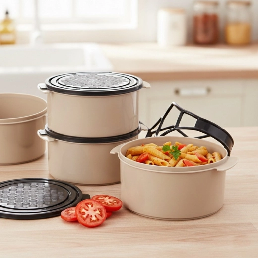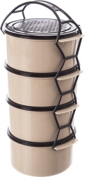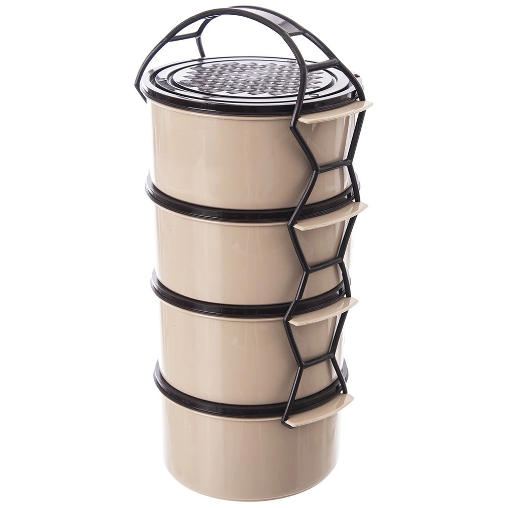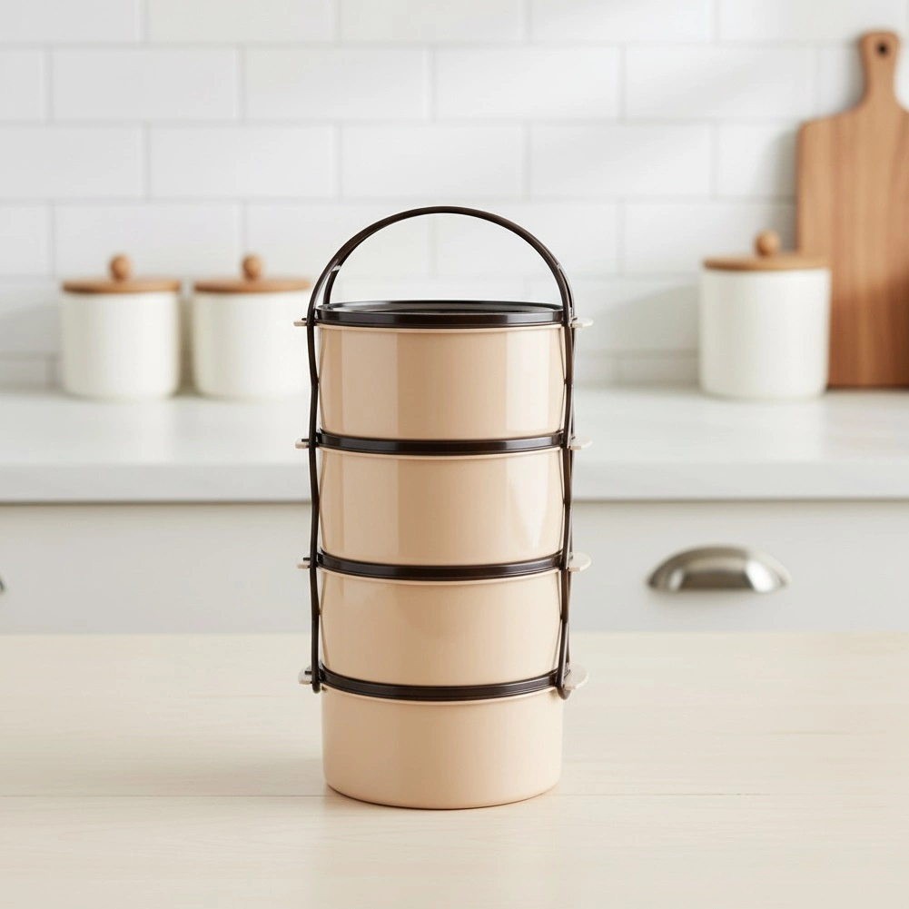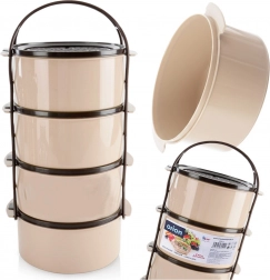 Geniet van eenvoudig vervoer van lunches en diners dankzij de tiffin met vier aparte bakjes van 1,5 l. Elk bakje heeft een eigen deksel en alles wordt bij elkaar gehouden door een robuust frame met handgreep, zodat u verschillende gangen veilig apart kunt meenemen. Ideaal voor reizen, uitstapjes, kamperen en voor dagelijks eten meenemen naar het werk.