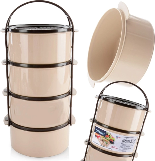 Praktische viervoudige voedselcontainer met een capaciteit van 4×1,5 l voor overzichtelijke scheiding van gerechten. Voorzien van stapelbare bakjes met deksels, een stevig dragend frame met handgreep en een duurzame uitvoering in beige‑bruine kleur. Geschikt voor de vaatwasser, koelkast, vriezer en voor de magnetron zonder deksels.