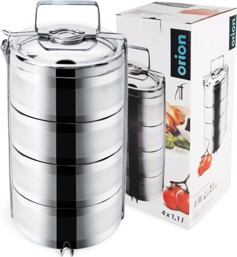 Praktische roestvrijstalen voedselcarrier met 4 gescheiden lagen en een capaciteit van 4×1,1 l houdt je gerechten langer warm of koud dankzij de dubbelwandige constructie met vacuümisolatie. Robuust roestvrij staal, veilige zijsnappers en een comfortabele handgreep zorgen voor eenvoudig meenemen van maaltijden naar werk, uitstapjes en picknicks.