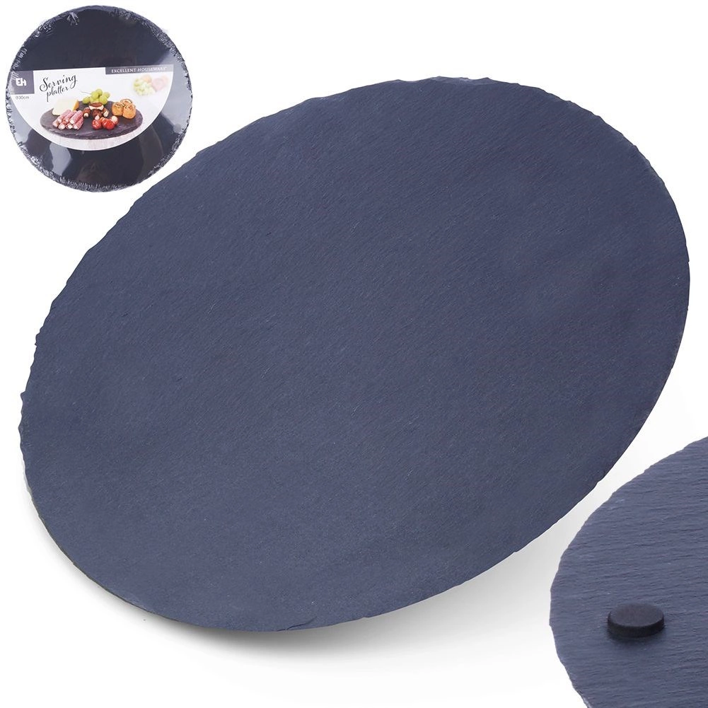 Dit ronde serveerplateau van natuursteen in grafietkleur geeft uw tafel een unieke, rustieke touch. De natuurlijk oneffen randen en het getextureerde oppervlak benadrukken het natuurlijke karakter, terwijl de duurzame steen gemakkelijk te reinigen is en gerechten prachtig presenteert.