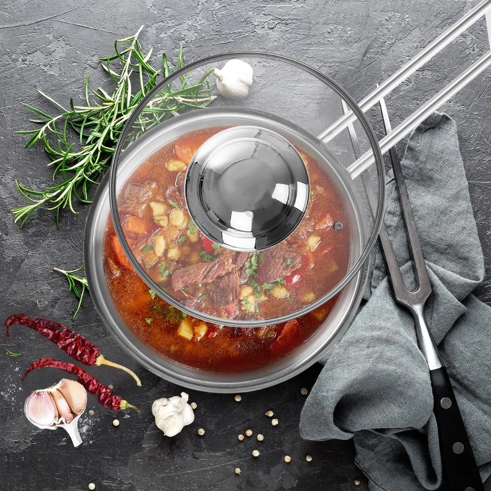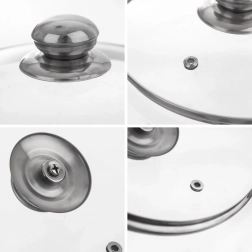 De geïntegreerde ontluchtingsopening voert overtollige stoom af en minimaliseert overkoken. Dankzij de licht bolle vorm circuleert hete lucht beter, wat de bereiding versnelt. De antislip roestvrijstalen rand zorgt voor een betrouwbare passing op het kookgerei en comfortabel gebruik.