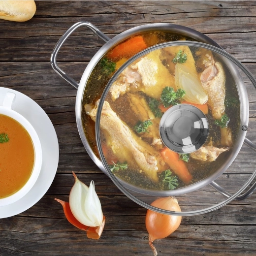 De robuuste roestvrijstalen ring en knop zorgen voor duurzaamheid en een lange levensduur. De geïntegreerde stoomuitlaat minimaliseert condensatie en voorkomt overkoken. Dankzij de stevige rand schuift het deksel niet en sluit het stevig aan op het kookgerei. Een uitstekende keuze voor dagelijks koken, stoven en slowcooking.