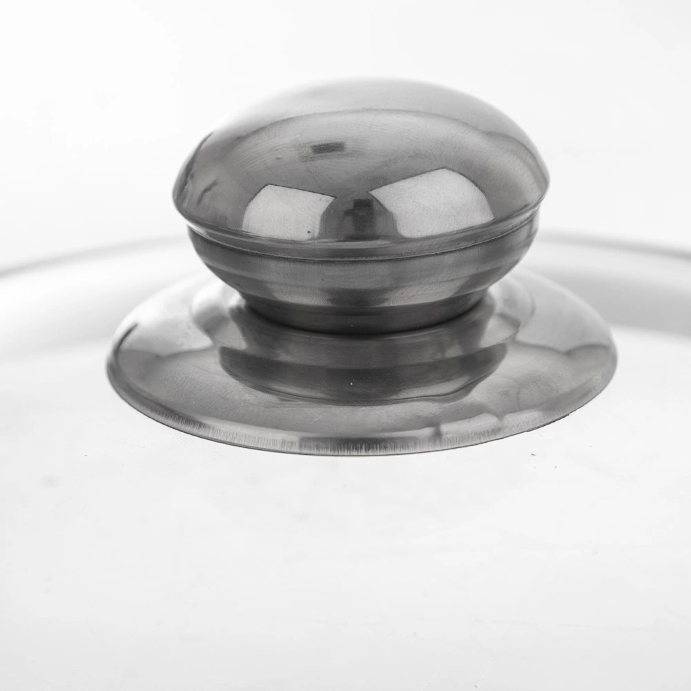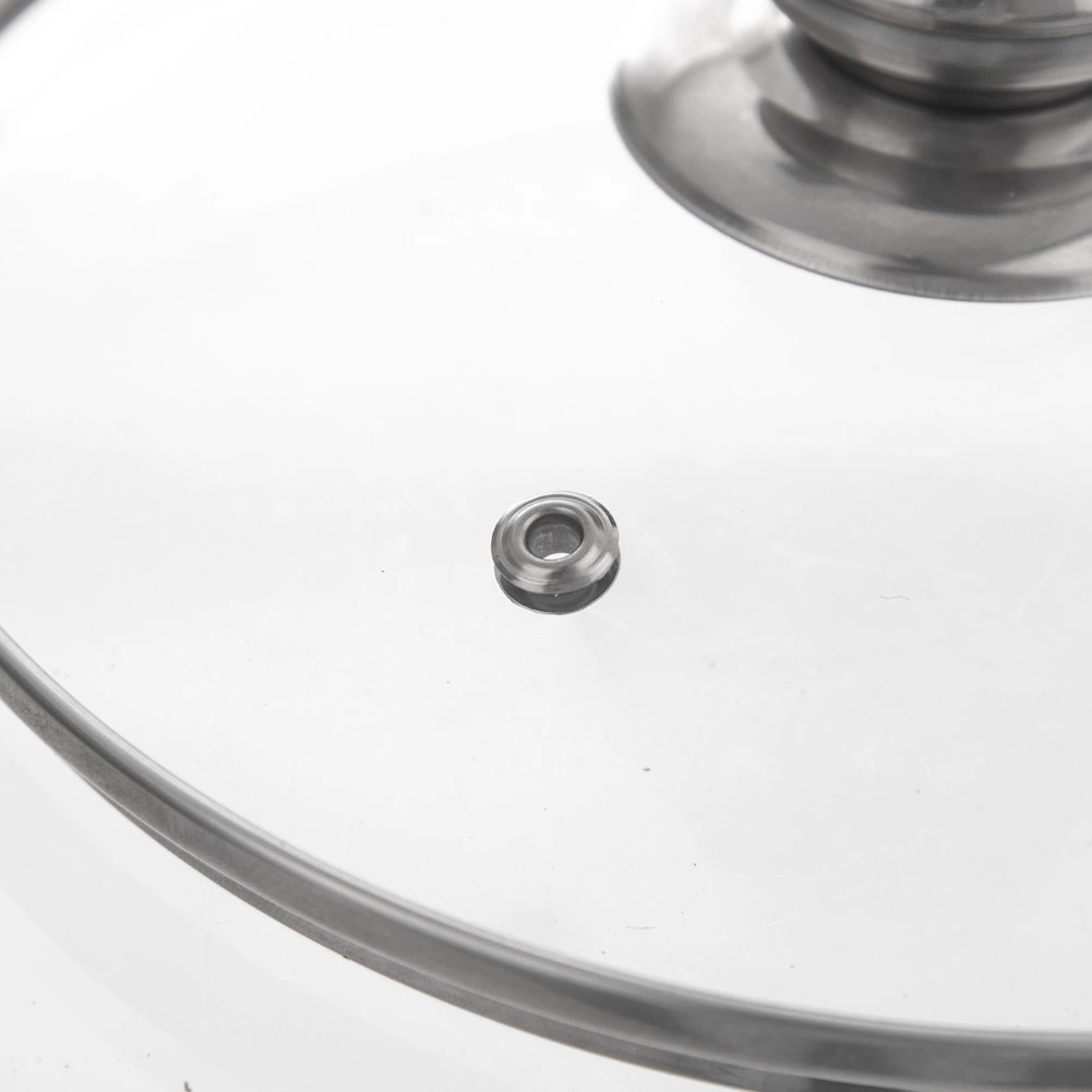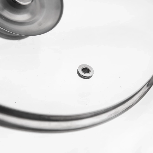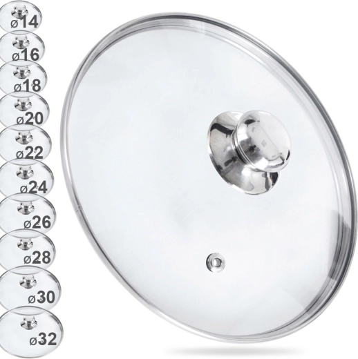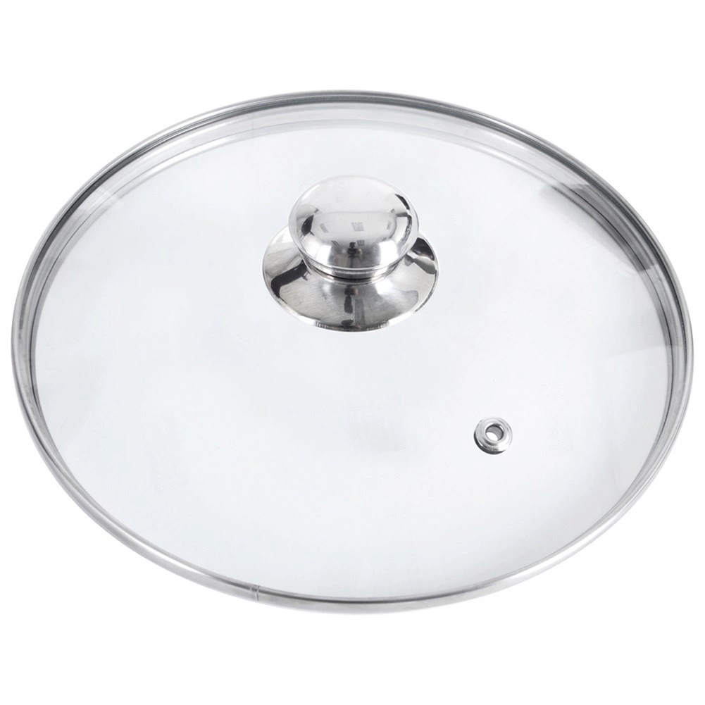 Universeel glazen deksel met een diameter van 30 cm, voorzien van een roestvrijstalen rand en een comfortabele knop. Geschikt voor potten, pannen en sauspannen, heeft een praktische stoomventiel en is hittebestendig tot 200 °C. Dankzij het transparante glas controleer je het koken eenvoudig zonder op te tillen en de roestvrijstalen rand zorgt voor een stevige en dichte passing.