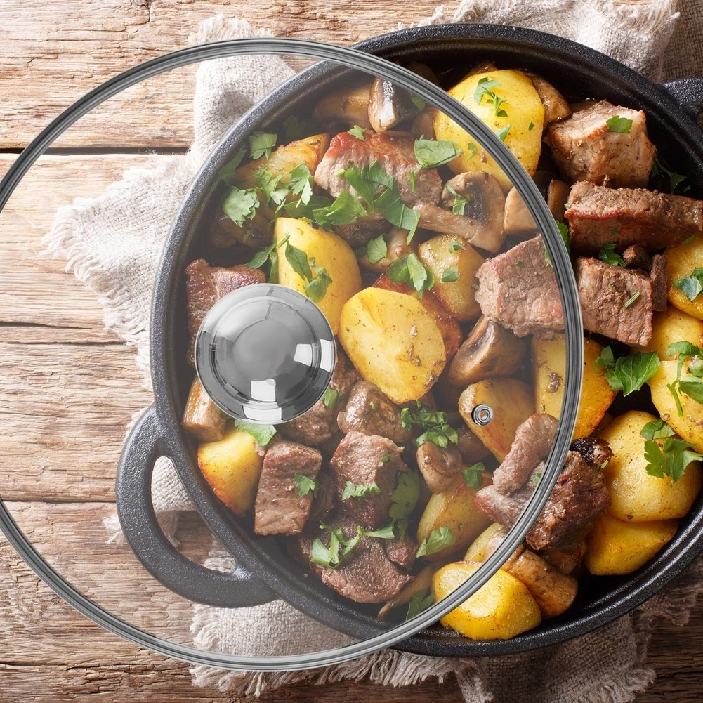 De licht gebolde vorm bevordert de circulatie van hete lucht en een gelijkmatige garing. Dankzij de rand glijdt het deksel niet van de pan en sluit het nauw aan, waardoor spatten van water en vet worden verminderd. Een perfecte aanvulling op kookgerei zonder meegeleverd deksel en qua afmeting passend op gangbare modellen met een diameter van 30 cm.