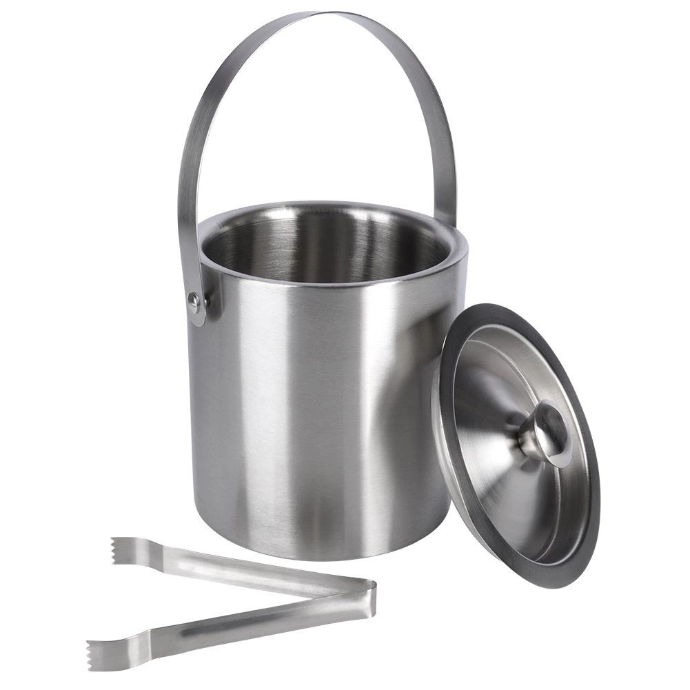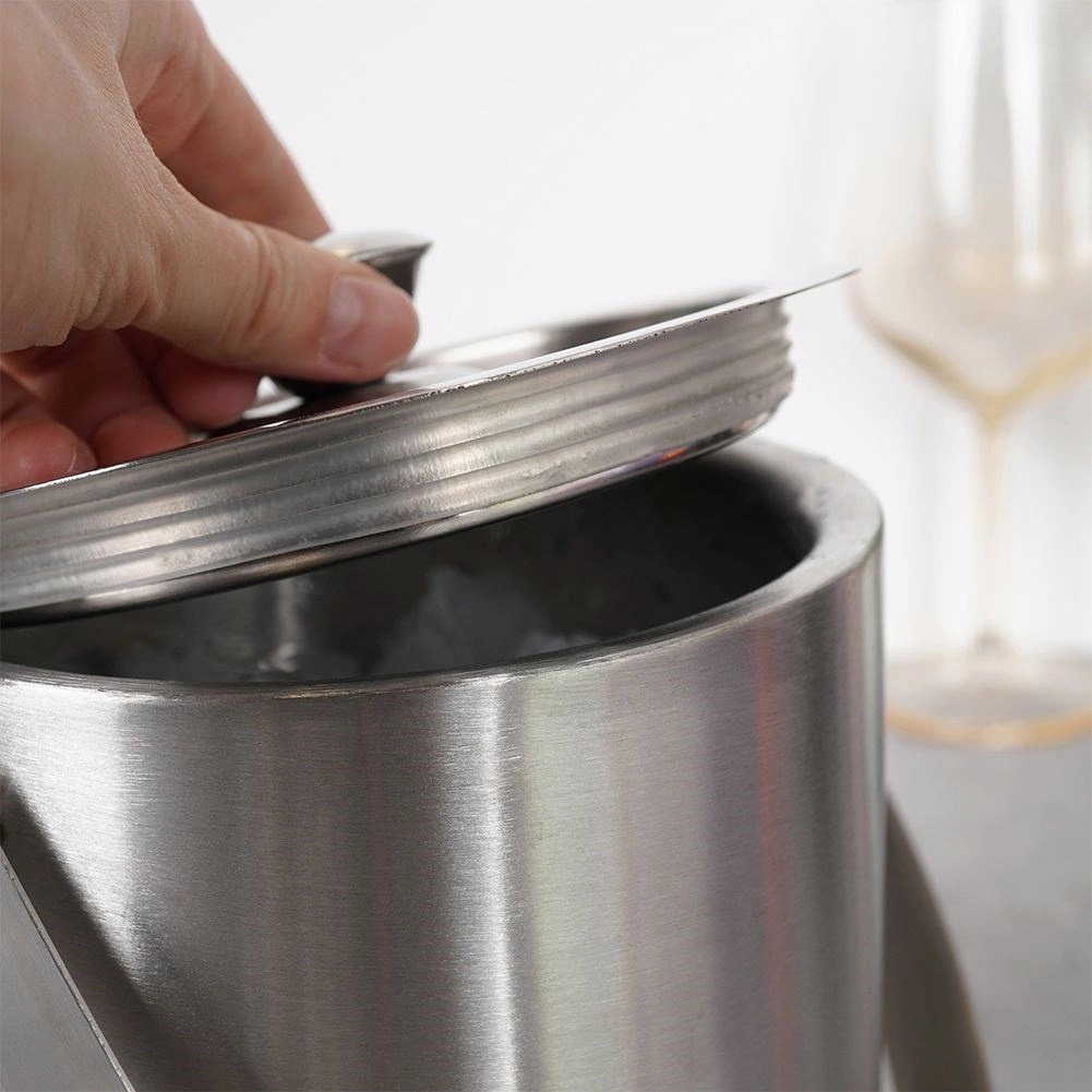 Elegante en duurzame ijsemmer van mat roestvrij staal houdt ijsblokjes langer perfect koel. Dankzij de dubbelwandige isolatie werkt hij als een thermische emmer en vertraagt het smelten. Inclusief goed sluitend deksel met greep en inklapbare handgreep voor comfortabel dragen.
