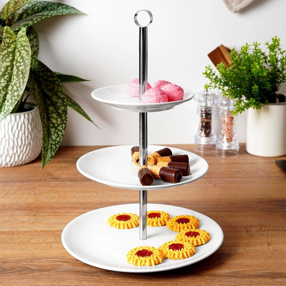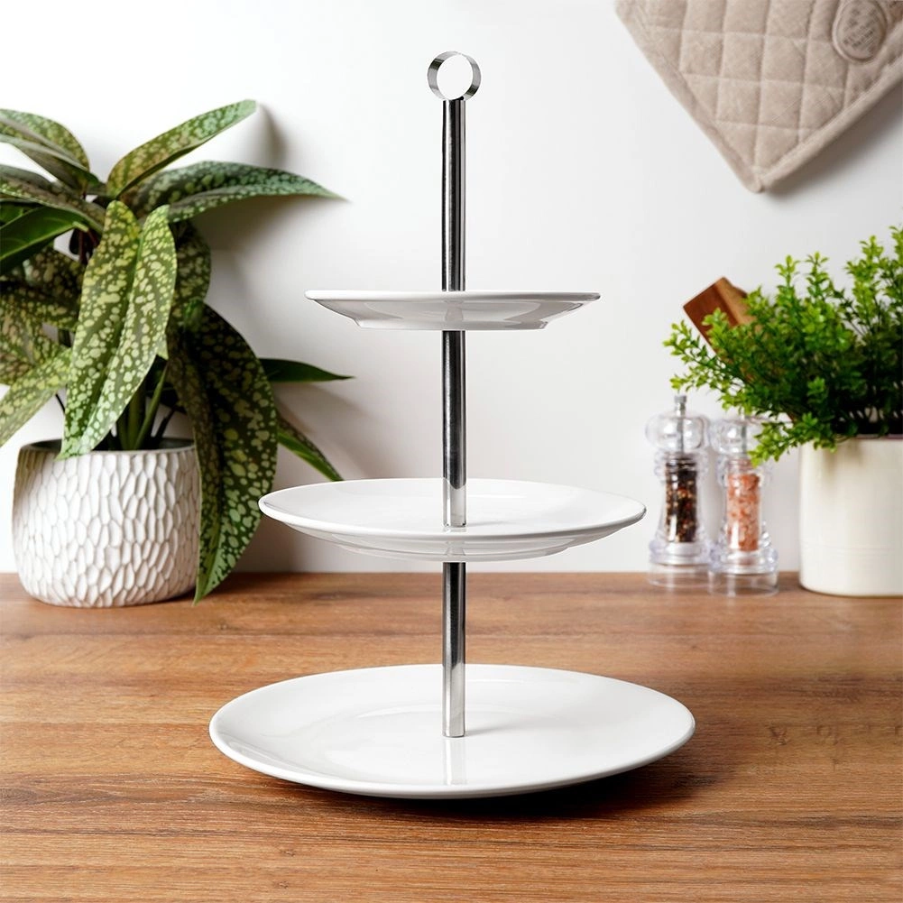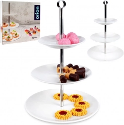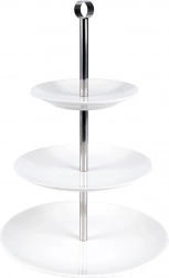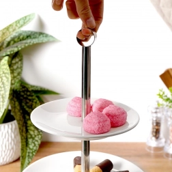 De borden zijn van glad wit porselein, bevestigd met een roestvrijstalen centrale staaf met draagring voor comfortabel hanteren. De etagère is een uitstekende keuze voor thuisgebruik, feestjes, sweet tables en professionele catering.
