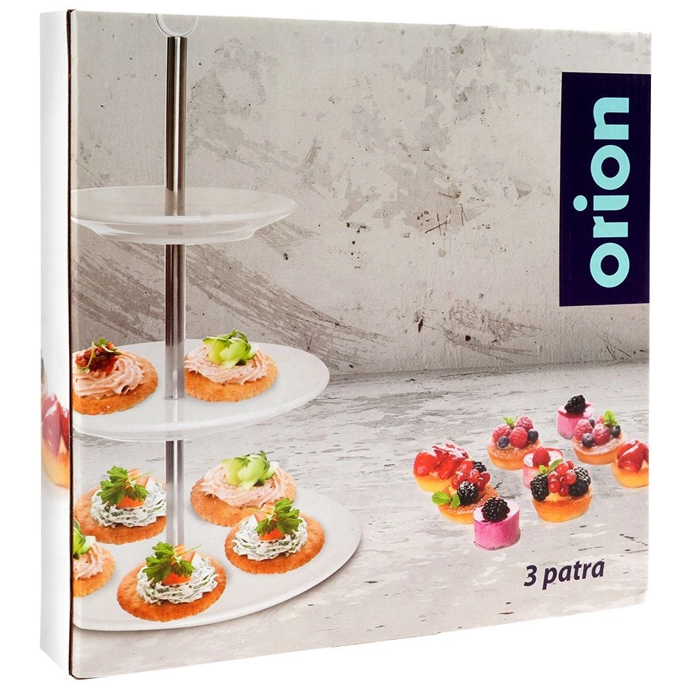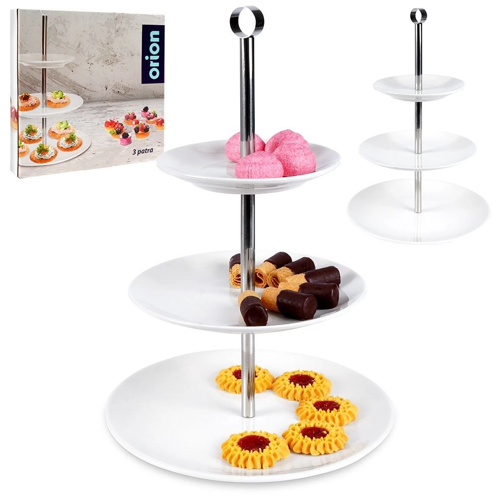 Deze stijlvolle etagère met bordsdiameters van 25,5 cm, 20,5 cm en 15,5 cm laat gebak, koekjes, macarons, fruit en hartige hapjes fraai uitkomen. De driedelige opbouw creëert een aantrekkelijke presentatie op meerdere niveaus en bespaart tegelijk ruimte op tafel.
