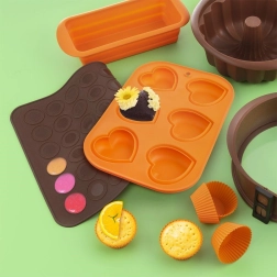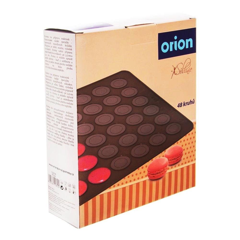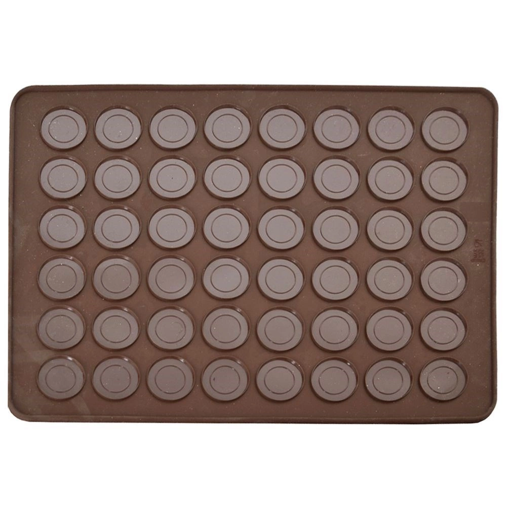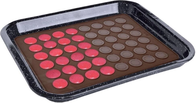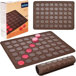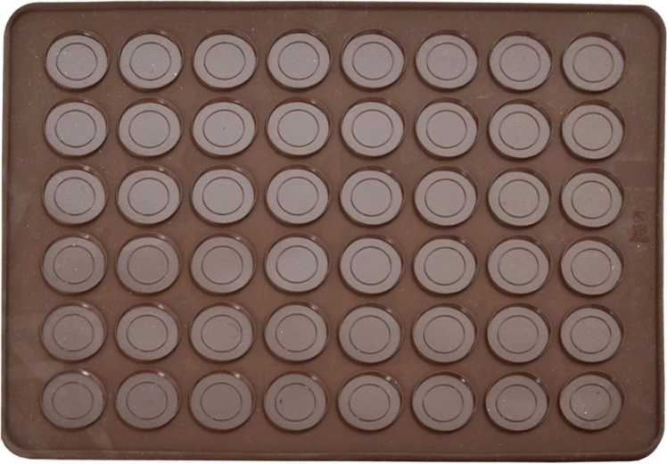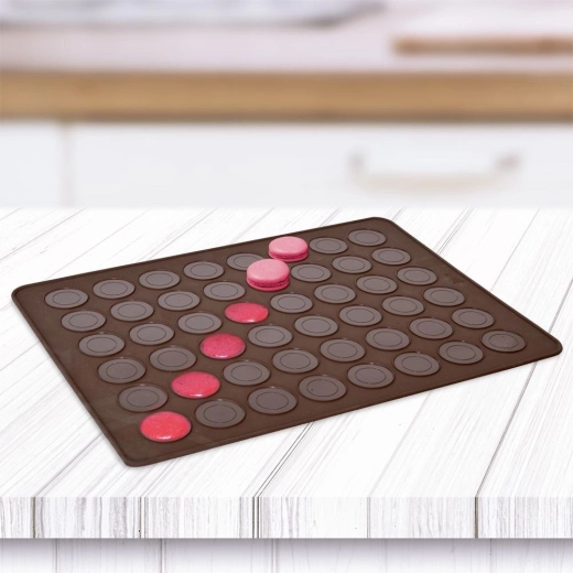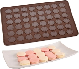 Praktische siliconen bakmat voor het bakken van tot 48 macarons met twee ringformaten (Ø 2,5 cm en 3,5 cm). Gemaakt van hoogwaardige siliconen met een antiaanbakoppervlak, hittebestendig van -40 °C tot +220 °C, geschikt voor oven, magnetron en vriezer en vaatwasser. Flexibel ontwerp voor gemakkelijke opslag zonder geuroverdracht.