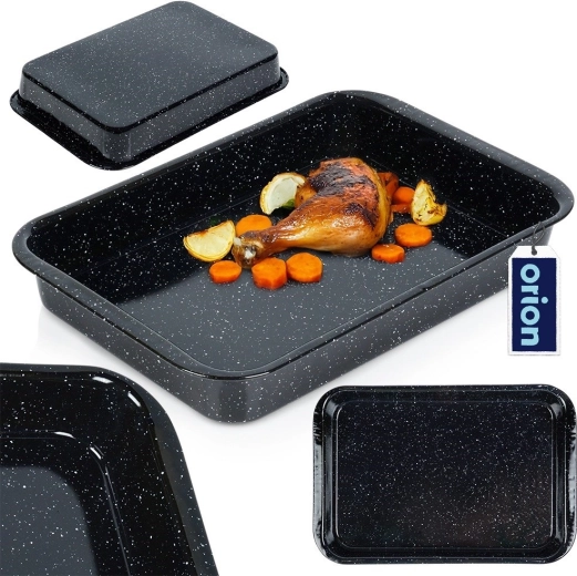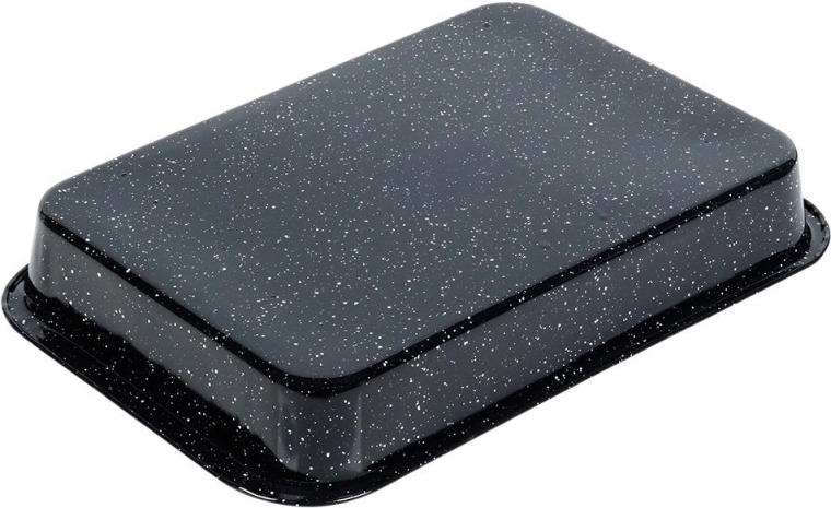 Praktische rechthoekige braadslede van hoogwaardige geëmailleerd staal met een inhoud van 3 l en afmetingen van 35,5 × 24 × 5 cm, ideaal voor het braden van vlees, groenten, taarten en homemade pizza. De duurzame emaillelaag is gezondheidsveilig en geschikt voor allergieën; voedsel bakt niet aan en is makkelijk te reinigen – ook in de vaatwasser. Geschikt voor gas- en elektrische ovens.