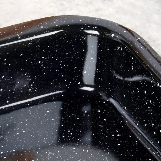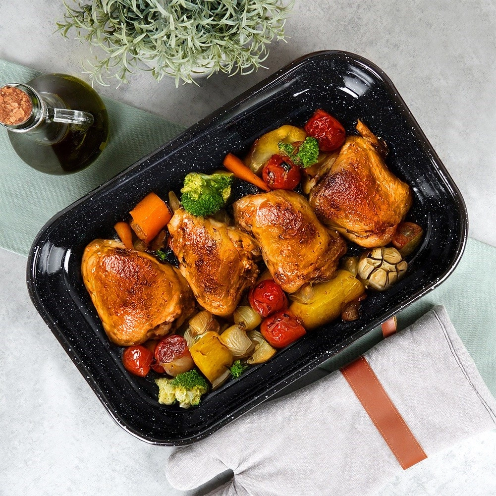 De rechthoekige braadslede van geëmailleerd staal is duurzaam, hygiënisch en geleidt warmte uitstekend voor gelijkmatige garing. Email is veilig voor de gezondheid en geschikt voor mensen met allergieën. Dankzij de universele afmetingen 38 × 24,5 × 7 cm (binnenmaat 36 × 22,5 × 6 cm) is hij ideaal voor het bakken van vlees, groenten, ovenschotels en desserts.