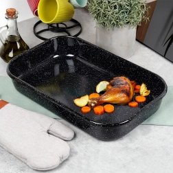 Robuuste gesmaltiseerde braadslede met afmetingen 42 × 27 × 7 cm (binnenmaat 39 × 25 × 7 cm) is een uitstekende keuze voor dagelijks koken en bakken. Het gesmaltiseerde oppervlak is hygiënisch, duurzaam en geschikt voor allergiepatiënten. De hoge randen zorgen voor gelijkmatig bakken en voldoende ruimte voor sappen en bijgerechten.