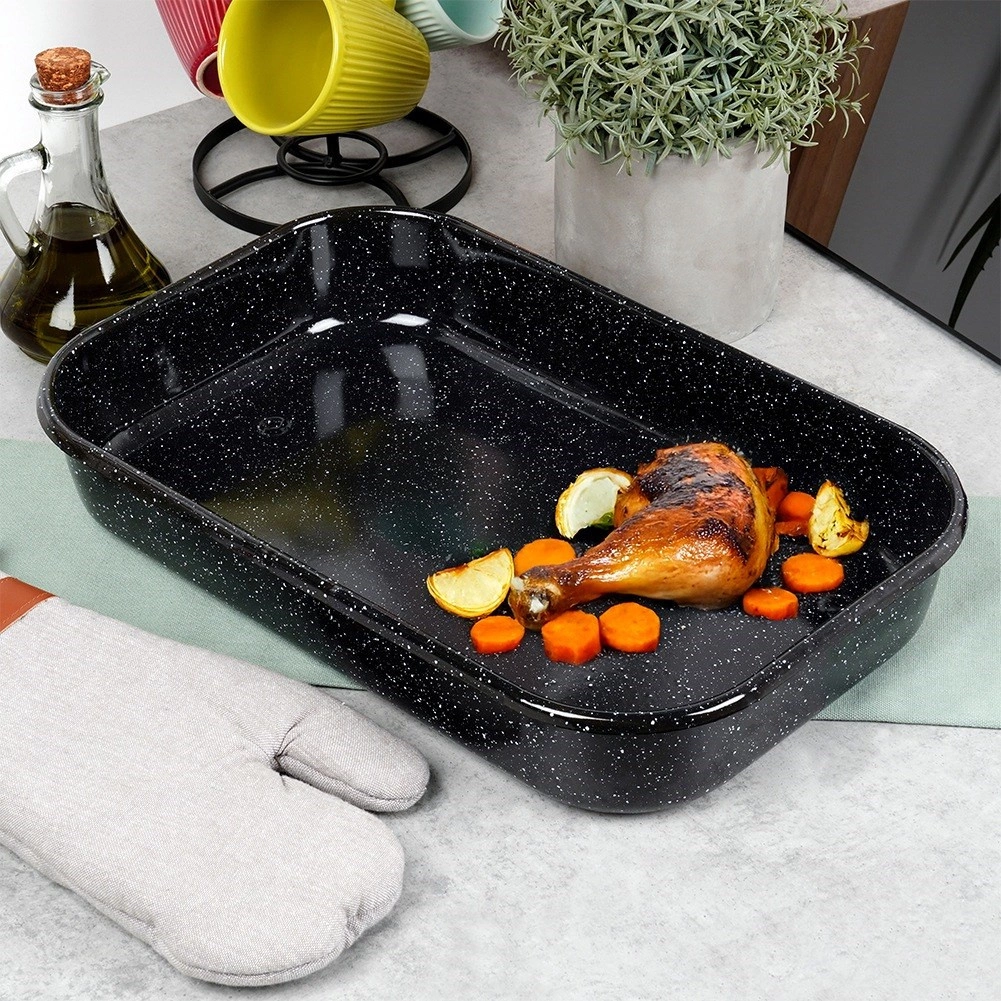 Afmetingen 42 × 27 × 7 cm (binnenmaat 39 × 25 × 7 cm) bieden voldoende ruimte voor het braden van vlees met groenten en sappen zonder over te lopen.
