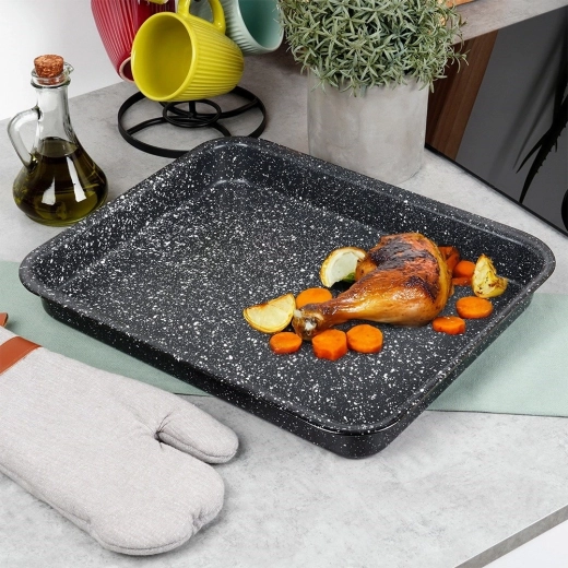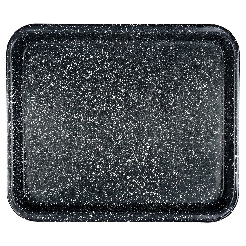 Dankzij de afmetingen 39,5 × 33,5 × 4,5 cm (intern 37 × 30 × 4 cm) bereidt u moeiteloos kip met groenten, geroosterde ribben, gegratineerde aardappelen, taarten en zelfs een huisgemaakte pizza met hogere rand. De braadslede is geschikt voor gas- en elektrische ovens en na het bakken eenvoudig schoon te maken – vaatwasmachinebestendig.