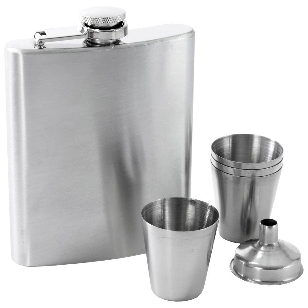 Elegante set voor liefhebbers van goede drank: stalen heupfles 210 ml met trechter en vier shotglaasjes in een cadeaubox. Gemaakt van hoogwaardige roestvrij staal die geen geuren vasthoudt en de smaak van de drank niet verandert. De heupfles heeft een lekdichte schroefdop en compacte afmetingen voor gemakkelijk meenemen – ideaal voor uitstapjes en feestjes. Een geweldig cadeau-idee.