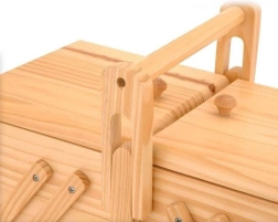 Deze elegante houten naaimand in een natuurlijke tint biedt doordachte opbergmogelijkheden voor naaibenodigdheden en creatieve kleinigheden. De harmonicaschuifconstructie maakt het mogelijk om alle niveaus met één vloeiende beweging te openen, zodat je alles meteen bij de hand hebt. De robuuste handgreep zorgt voor veilig en comfortabel dragen.
