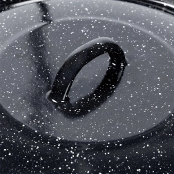 De stalen body met emaille is bestand tegen krassen en corrosie, terwijl de robuuste greep veilig optillen garandeert, zelfs bij hogere temperaturen. Emaille kan van nature kleine productoneffenheden vertonen (bobbels, ongelijkmatige spuitlaag e.d.), die de kwaliteit of functionaliteit niet beïnvloeden.
