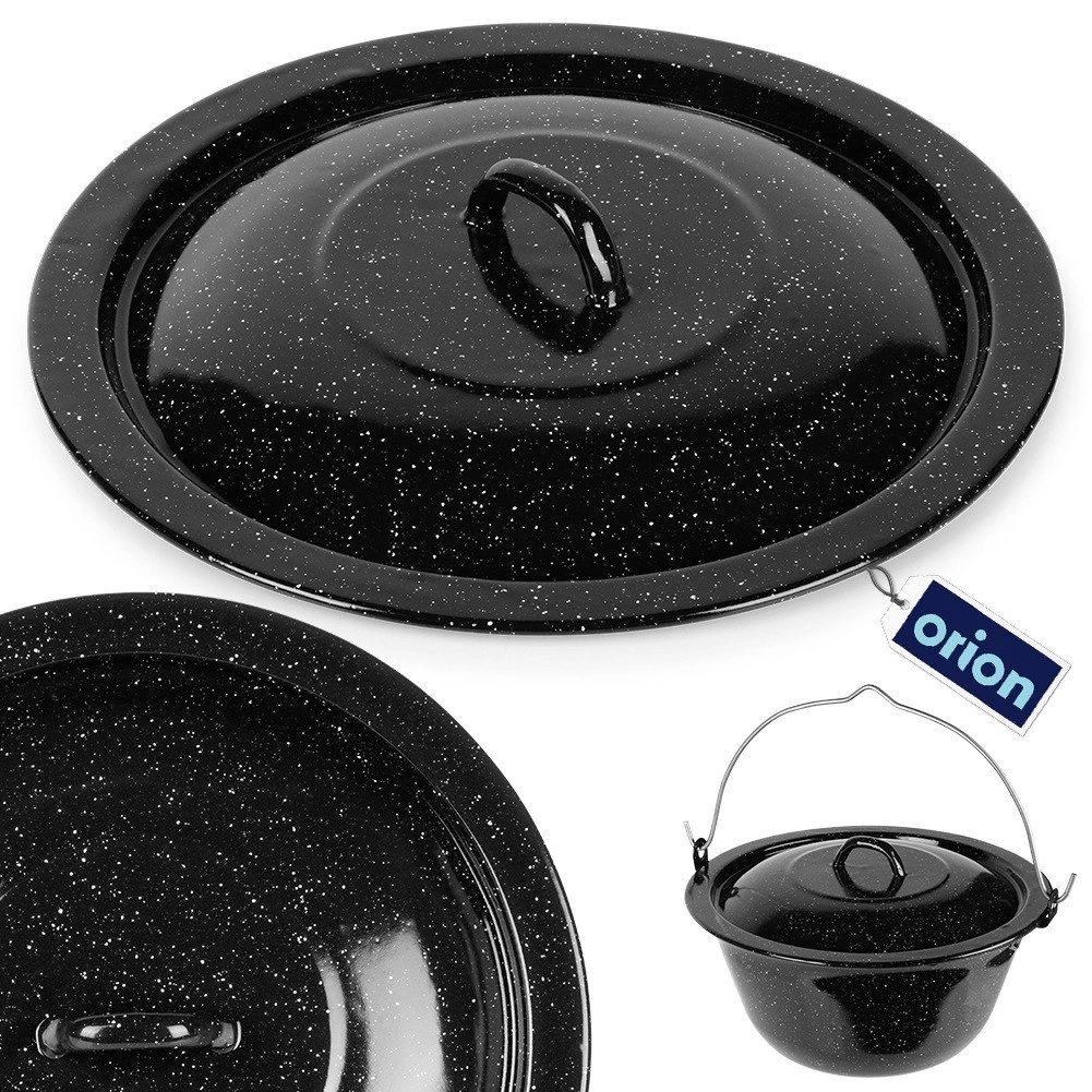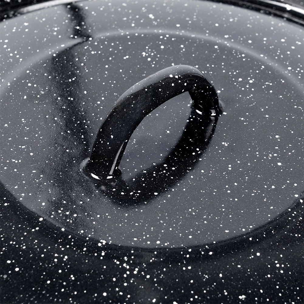 De zwarte emaille beschermt tegen corrosie en krassen, is hygiënisch en gemakkelijk te reinigen – ideaal voor regelmatig buiten koken.