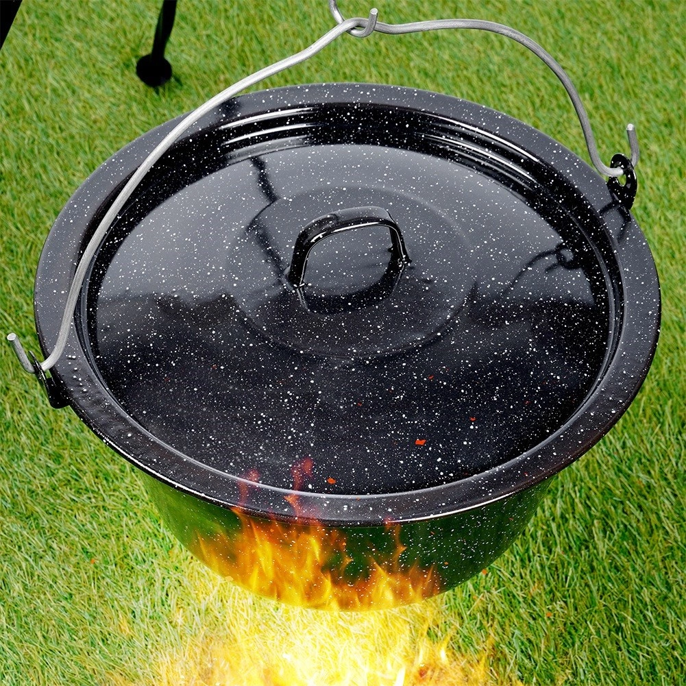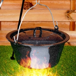 De centrale metalen greep maakt het eenvoudig om het deksel op te tillen, zelfs tijdens koken boven open vuur.