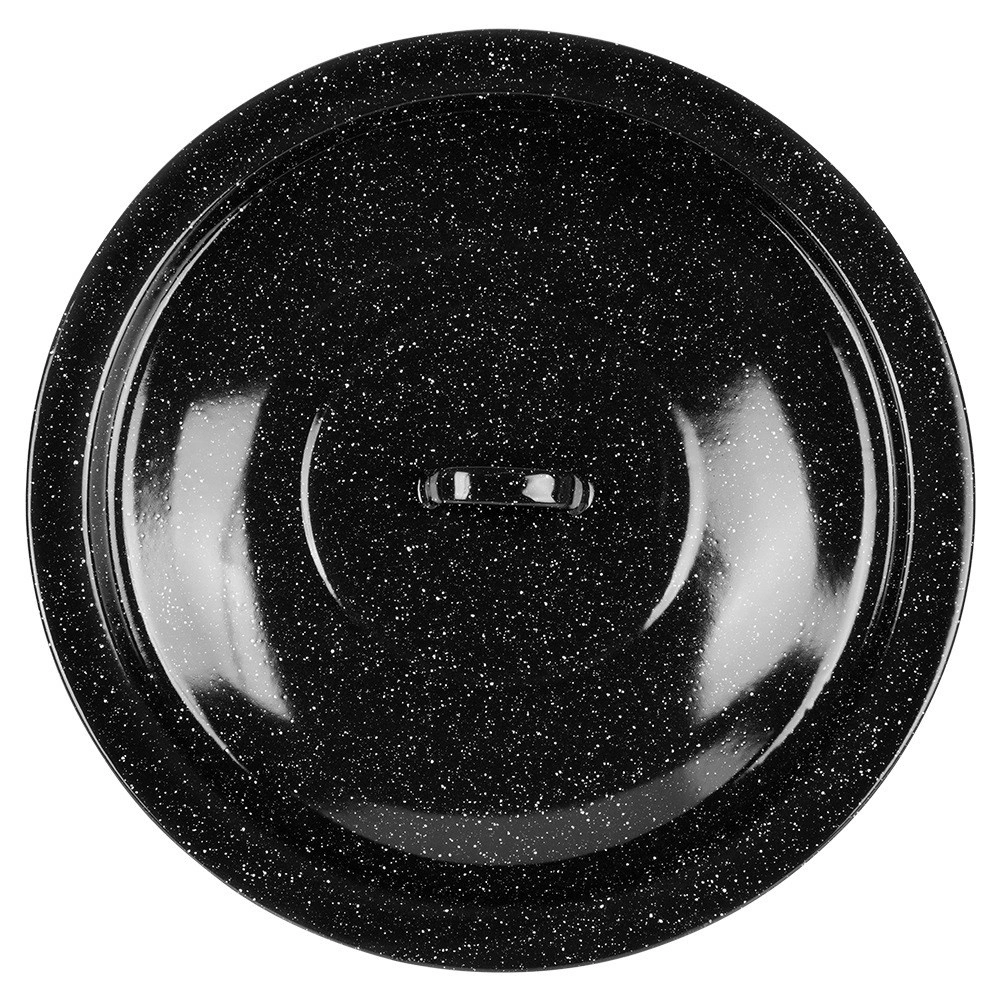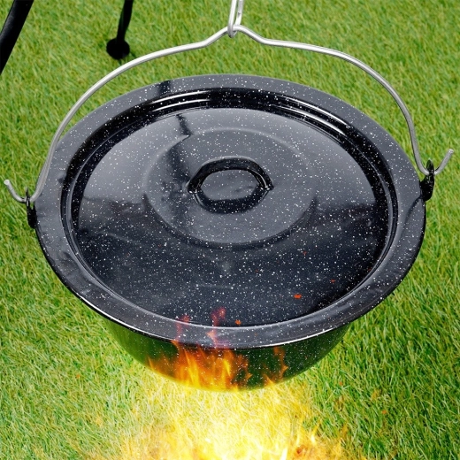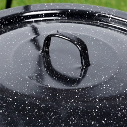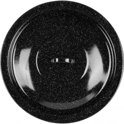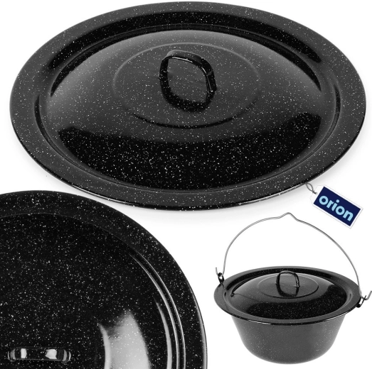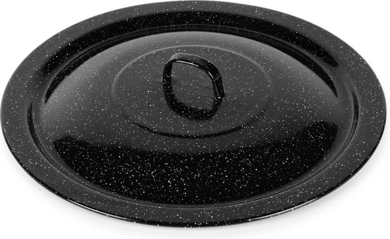 Robuuste deksel van zwart gespikkeld geëmailleerd staal, ideaal voor koken in de natuur en in de tuin. Houdt warmte en vocht in de ketel vast, versnelt het koken en verbetert de smaak van soepen, goulash en stoofgerechten. Geschikt voor Hongaarse ketels met een inhoud van 13 l (diameter 40 cm).