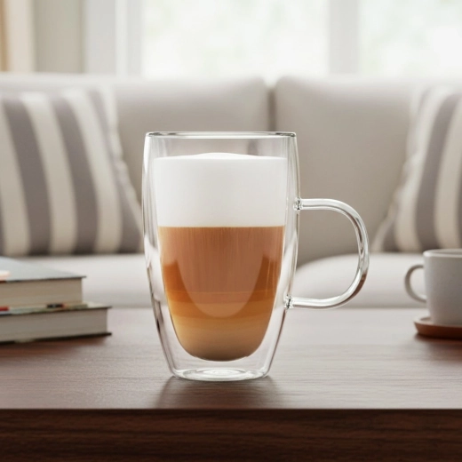 Dit design thermoglas met dubbele wand is een uitstekende keuze voor alledaagse koffierituelen en stijlvol serveren. De dubbele wand van borosilicaatglas biedt effectieve thermische isolatie, zodat je kunt genieten van de perfecte dranktemperatuur zonder je handen te branden en met minimale condensvorming aan de buitenkant.