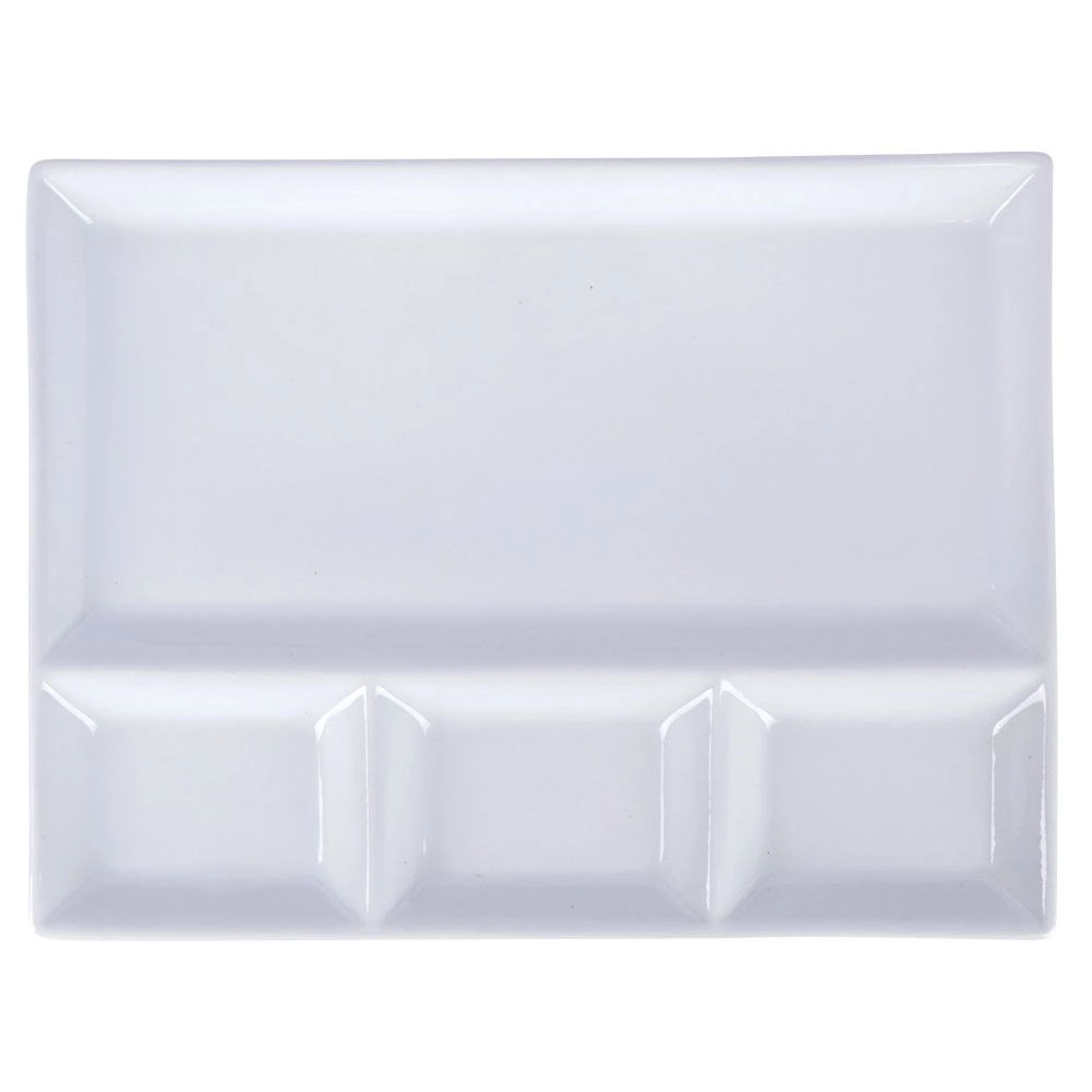 Universeel gedeeld bord van hoogwaardig wit porselein dat uw tafel een cleane en moderne uitstraling geeft. Vier praktische secties maken gescheiden serveren van verschillende gerechten, sauzen of bijgerechten mogelijk, zodat smaken niet mengen en elk ingrediënt tot zijn recht komt.
