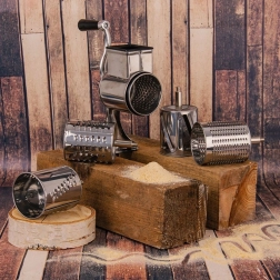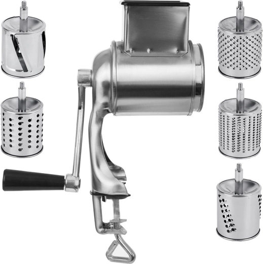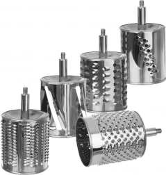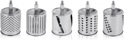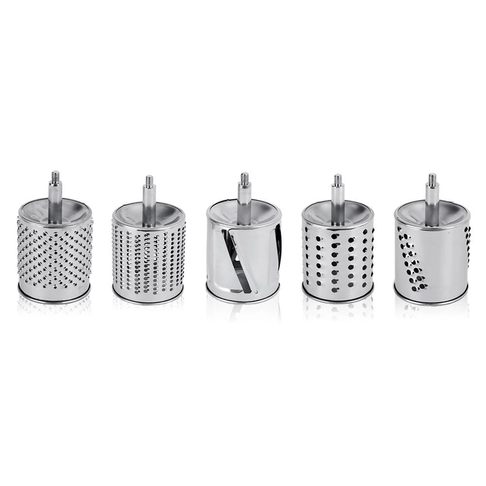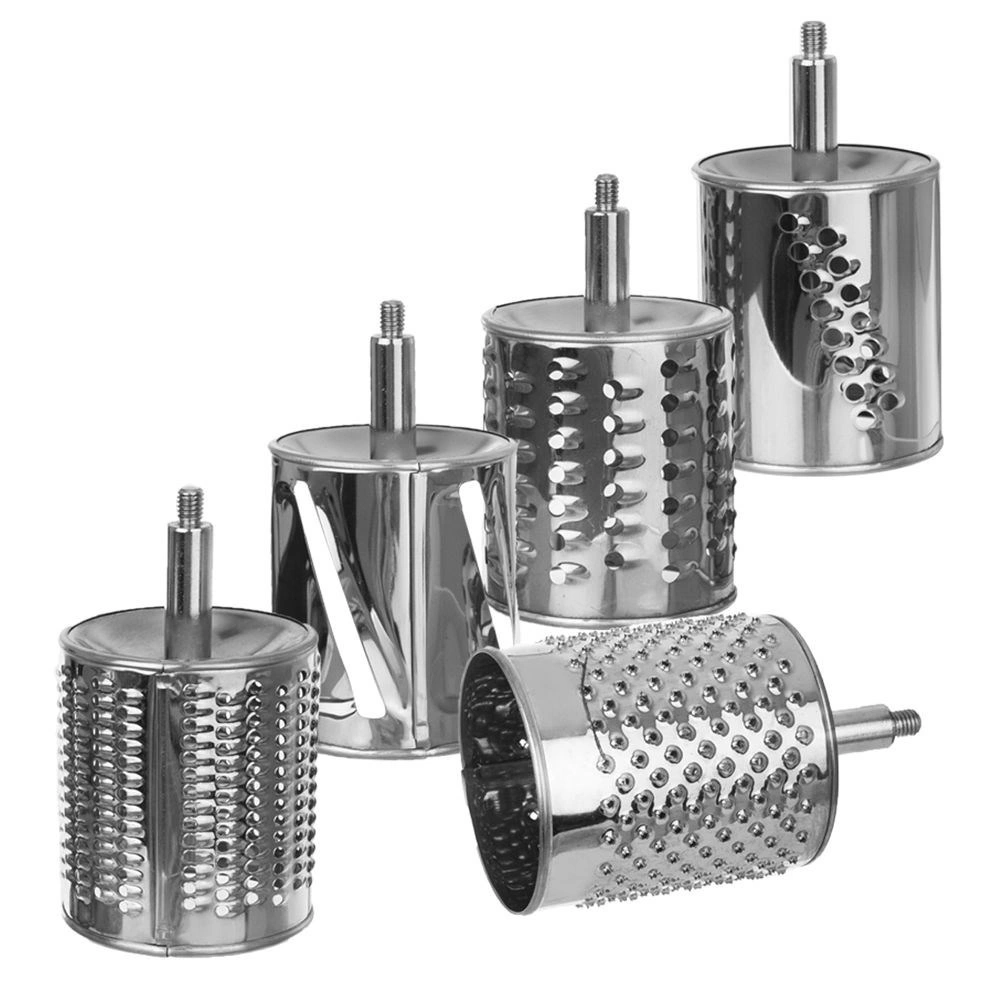 De set van 5 roestvrijstalen trommels dekt fijn en grof raspen, schaven en malen. Ideaal voor kaas, noten, chocolade, groenten en fruit.