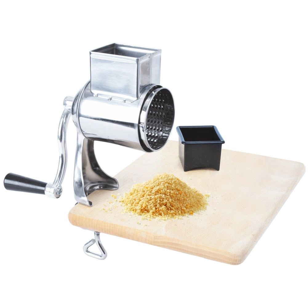 In de verpakking zitten 5 verwisselbare trommels voor fijn en grof raspen, snijden en malen. Hiermee maakt u verse paneermeel, raspt u kaas, noten of chocolade en snijdt u fruit en groenten voor salades of desserts. Dankzij de beschermende pads beschadigt de klem het blad niet en blijft het apparaat stevig op zijn plaats.